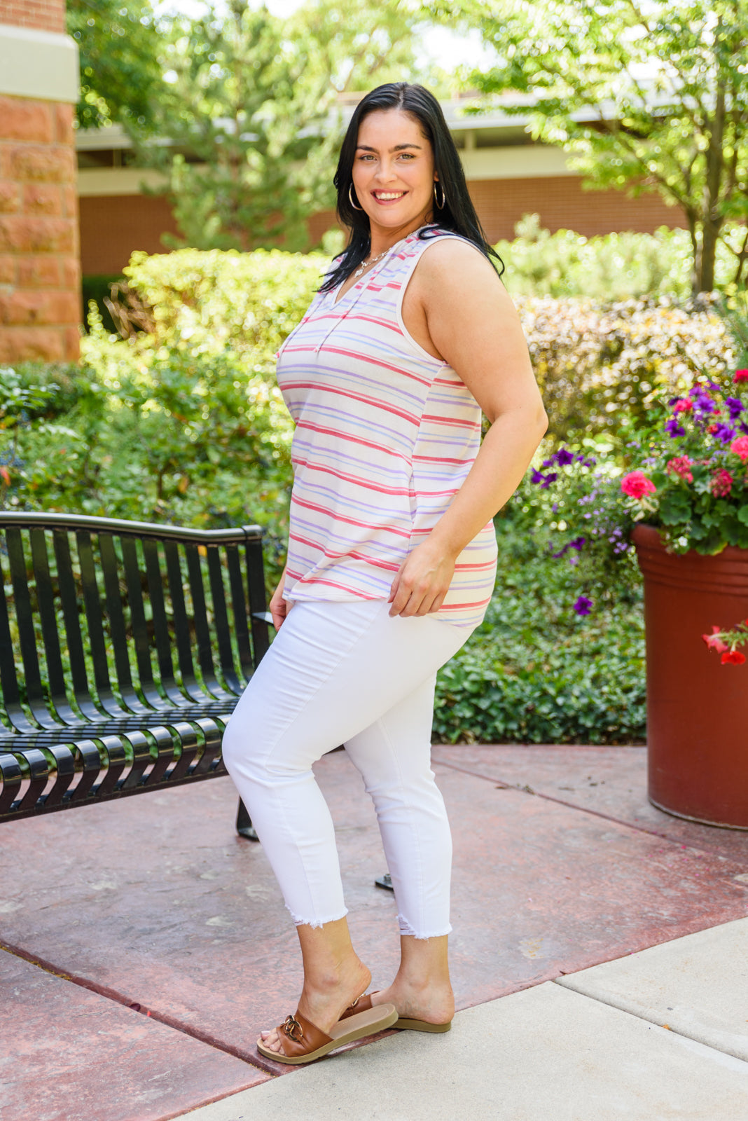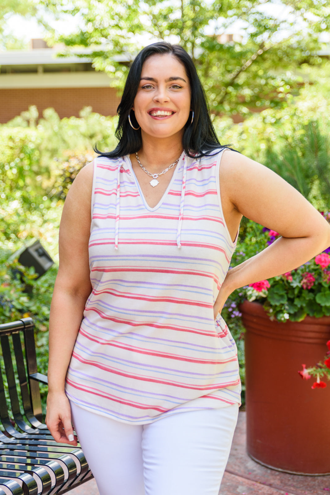 We are so excited to style our new Take A Day Off Hooded Tank! While it has endless styling options, we're pairing it with our bikini and denim cutoffs and heading to the pool! Featuring a notched neckline with faux drawstrings, stretchy soft fabric, and a fun hood in the back! With a sleeveless cut and flowy silhouette this makes for the perfect throw-on piece.