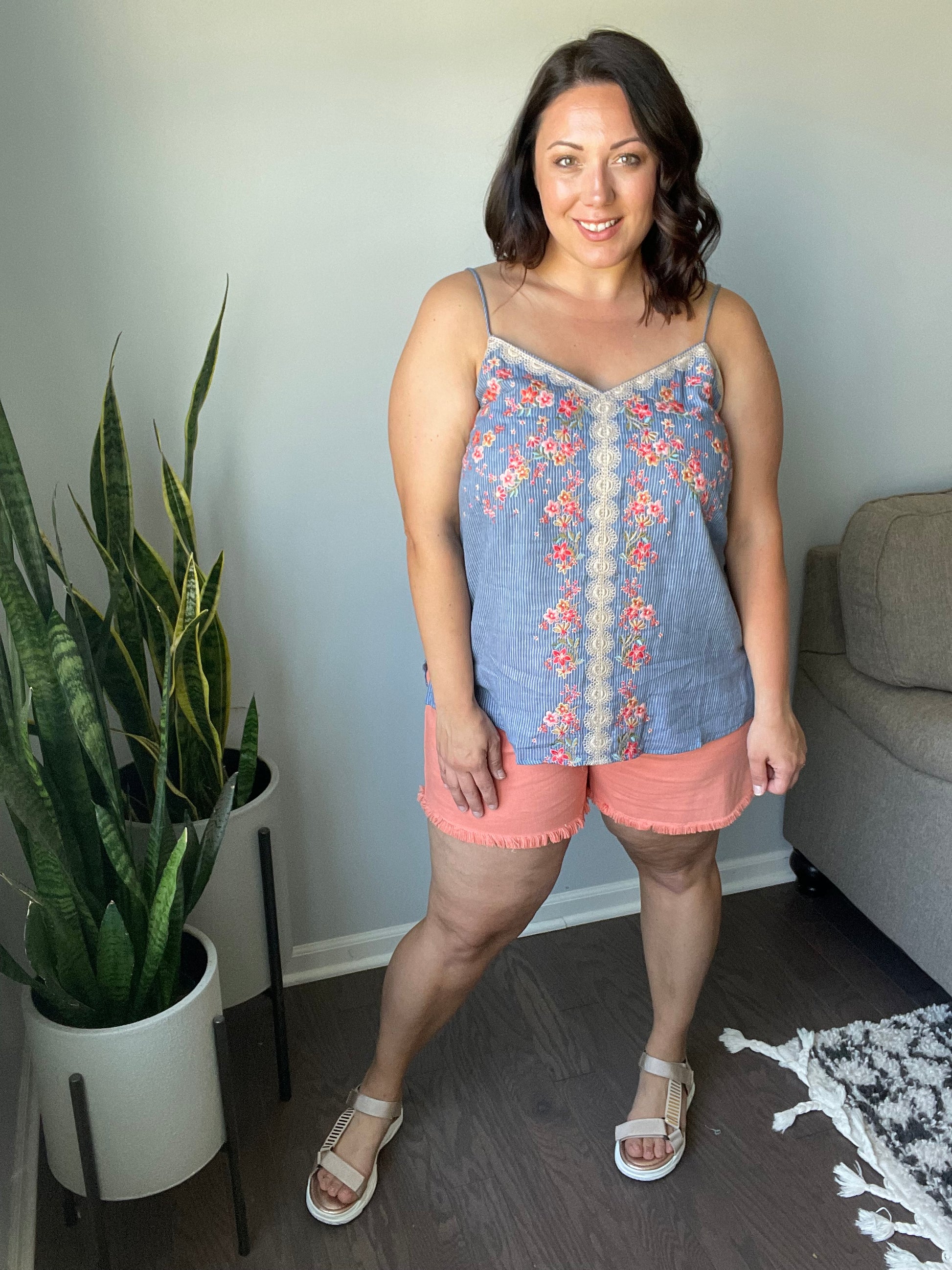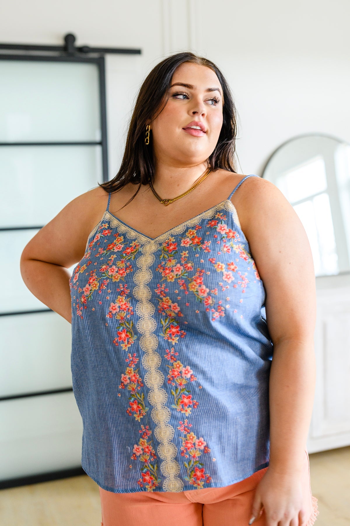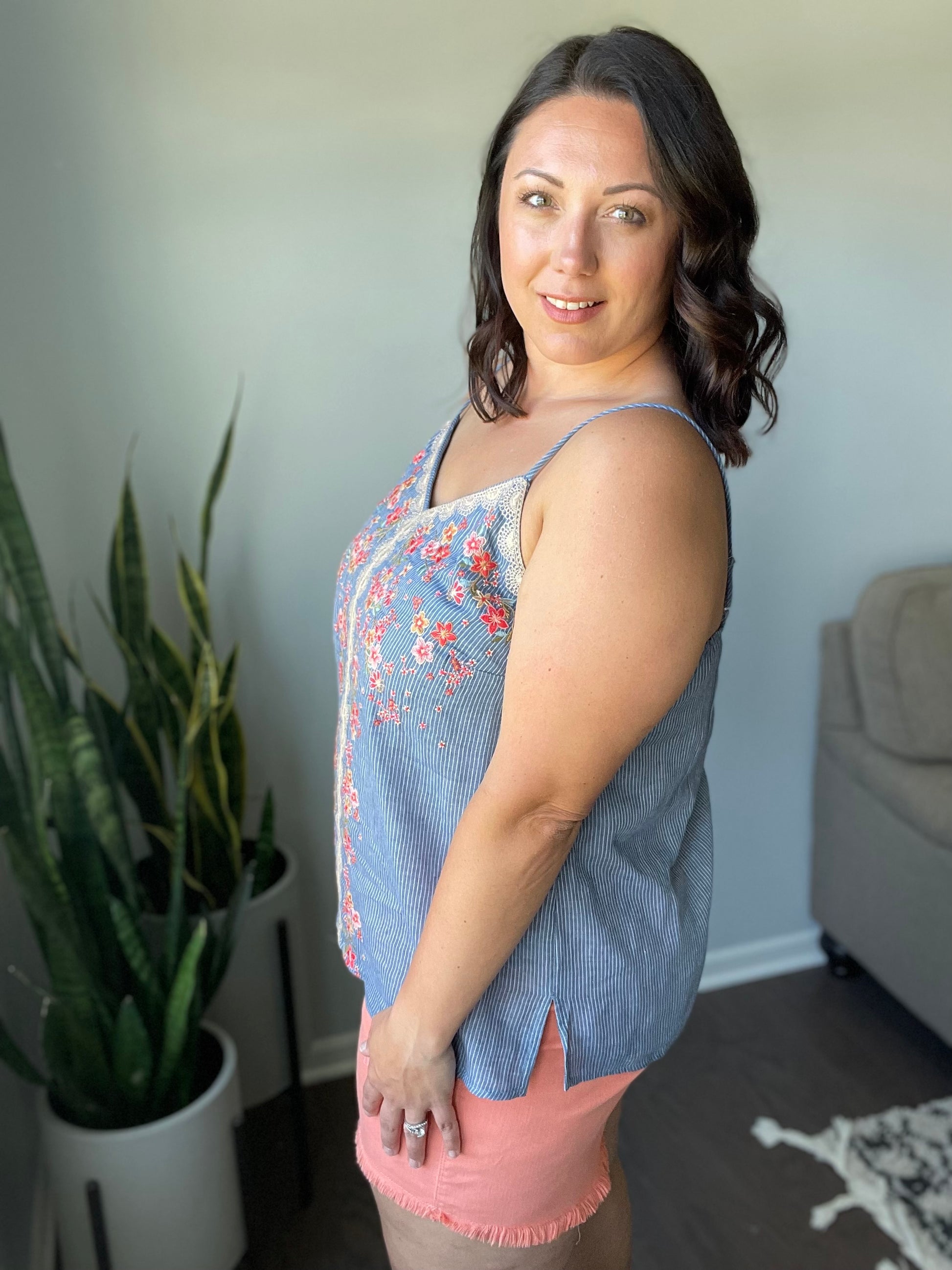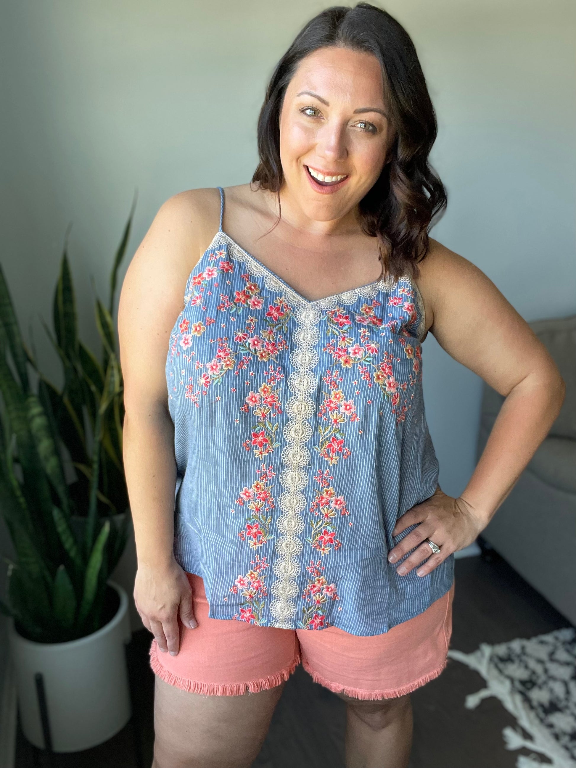 The Take Me To Greece Tank is an all-around winner! The subtle pinstripe fabric is embroidered with gorgeous flowers and a lace-like design. Pair with white jeans or your favorite pair of shorts and stay cool this summer!