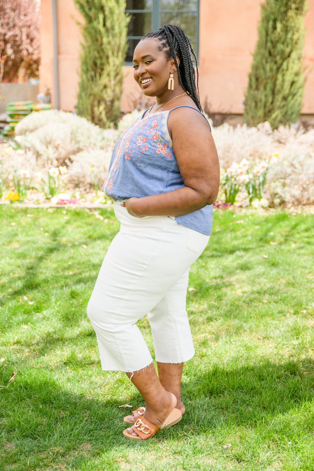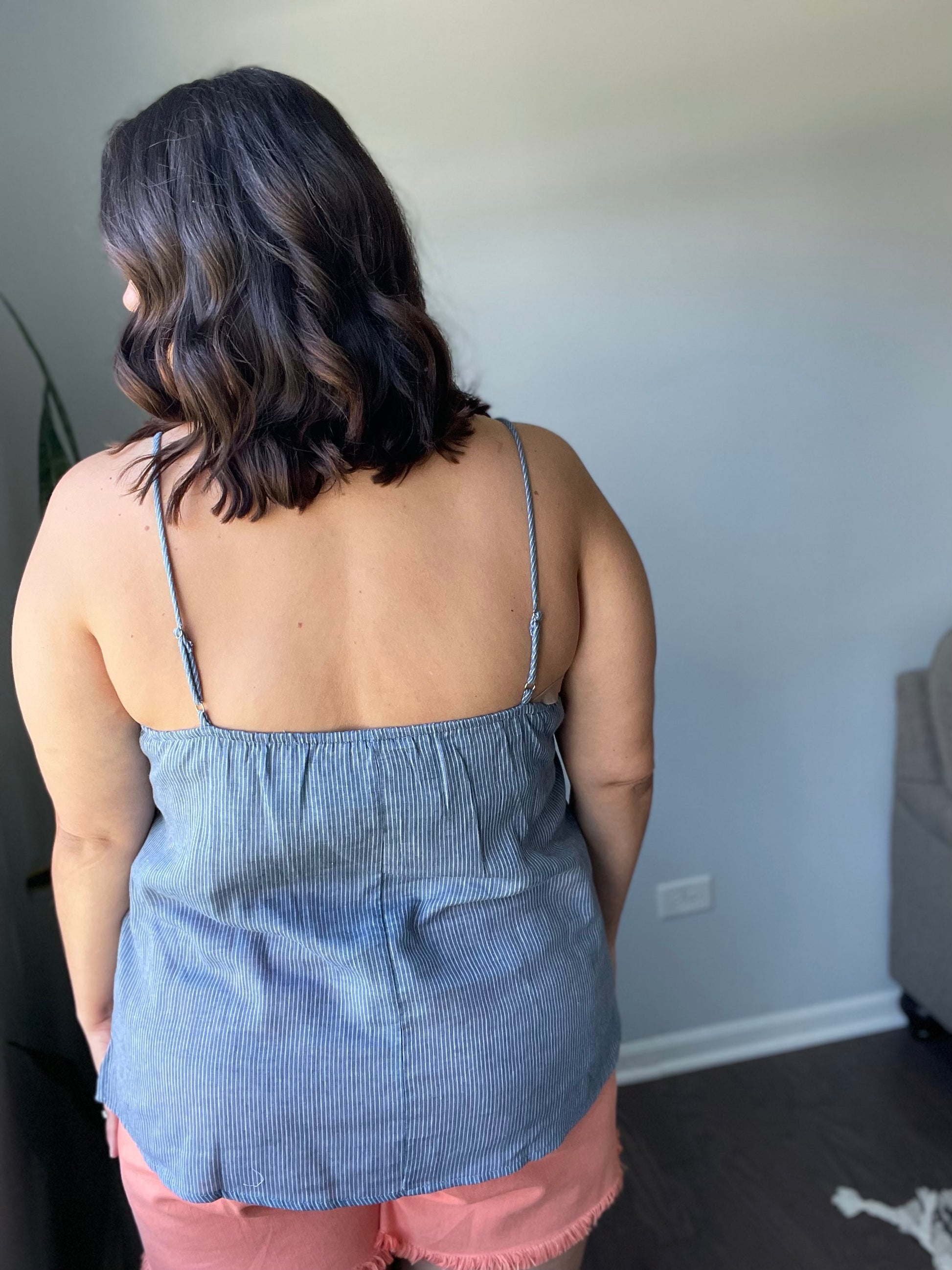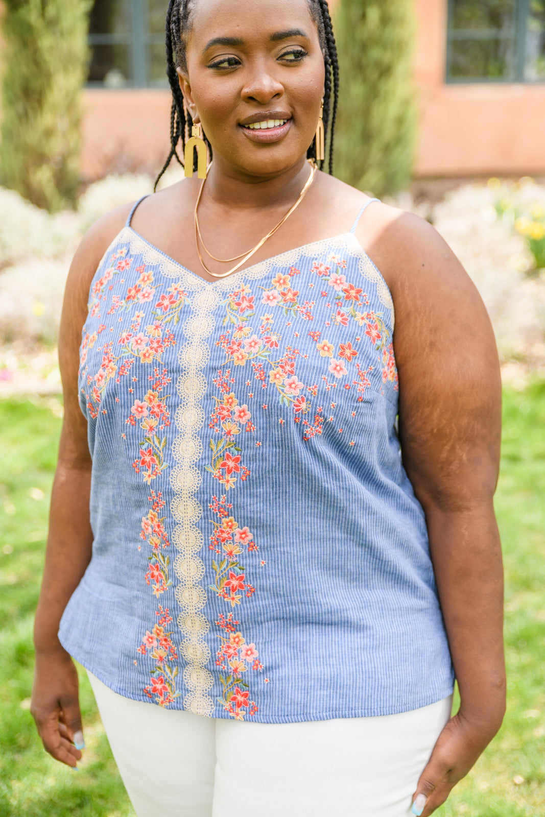 The Take Me To Greece Tank is an all-around winner! The subtle pinstripe fabric is embroidered with gorgeous flowers and a lace-like design. Pair with white jeans or your favorite pair of shorts and stay cool this summer!