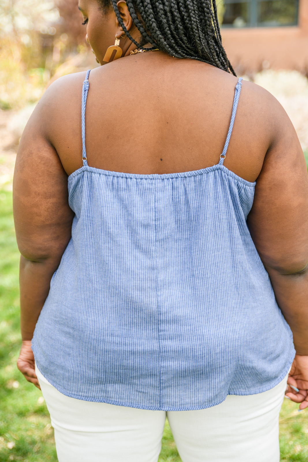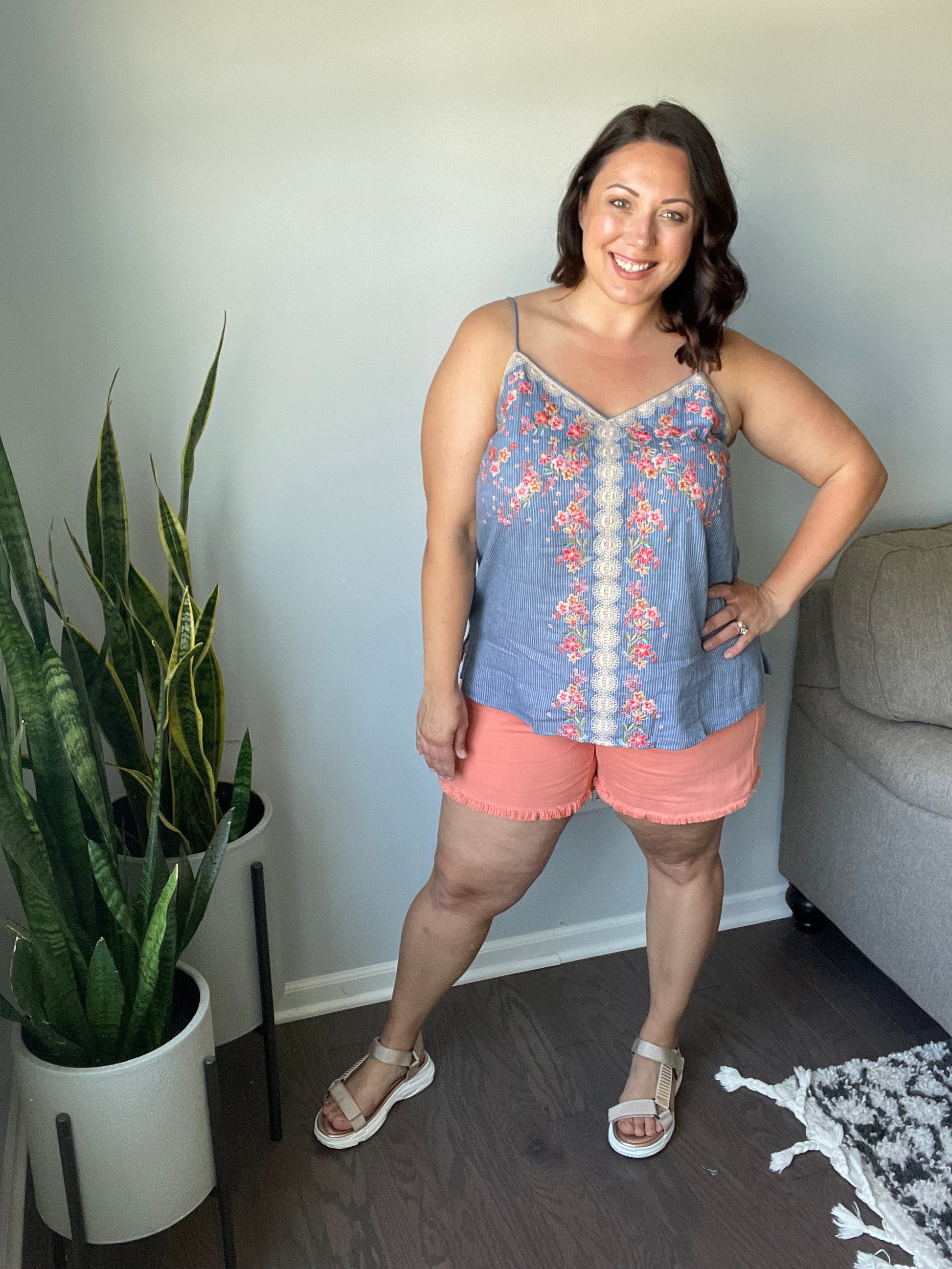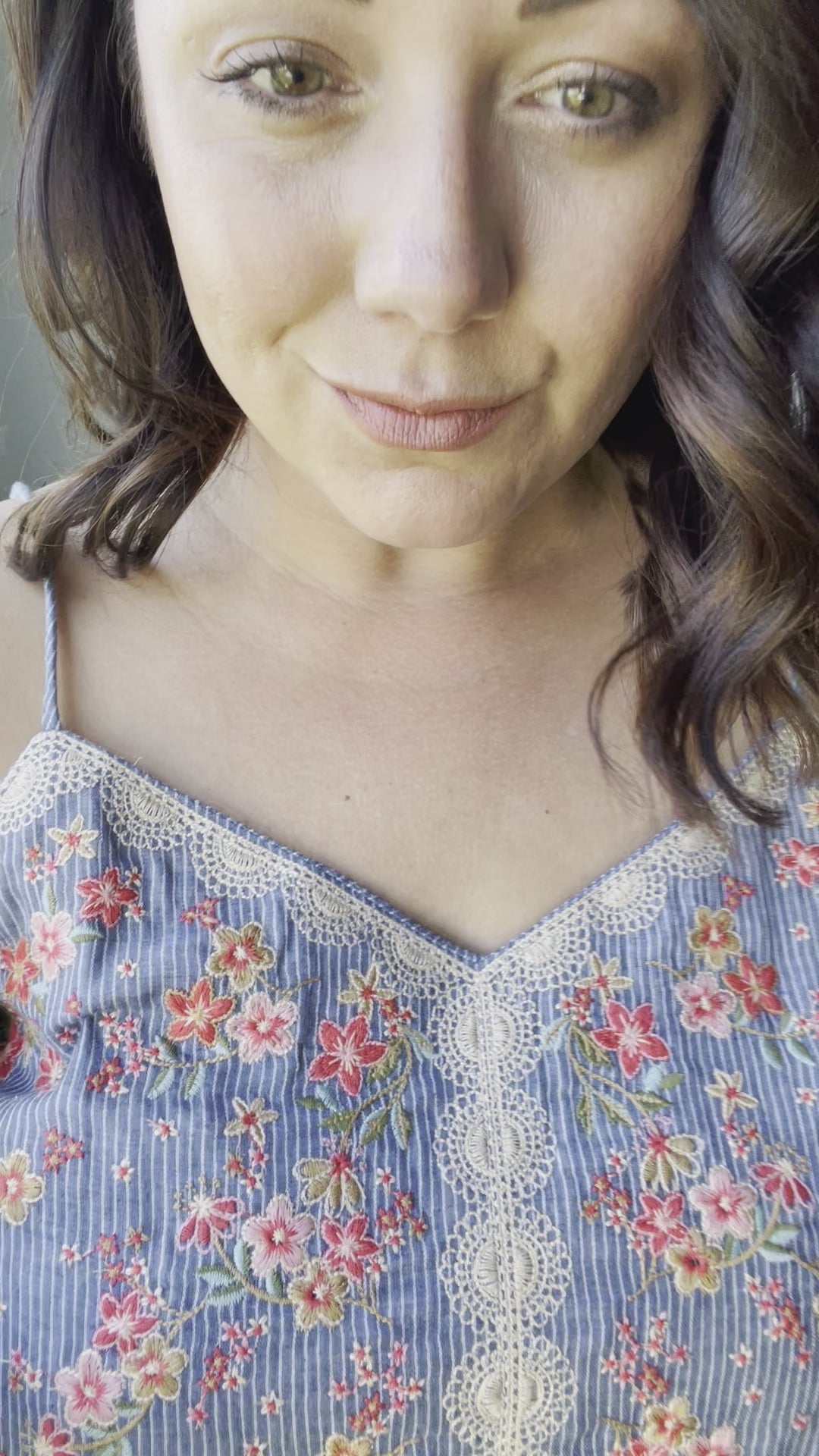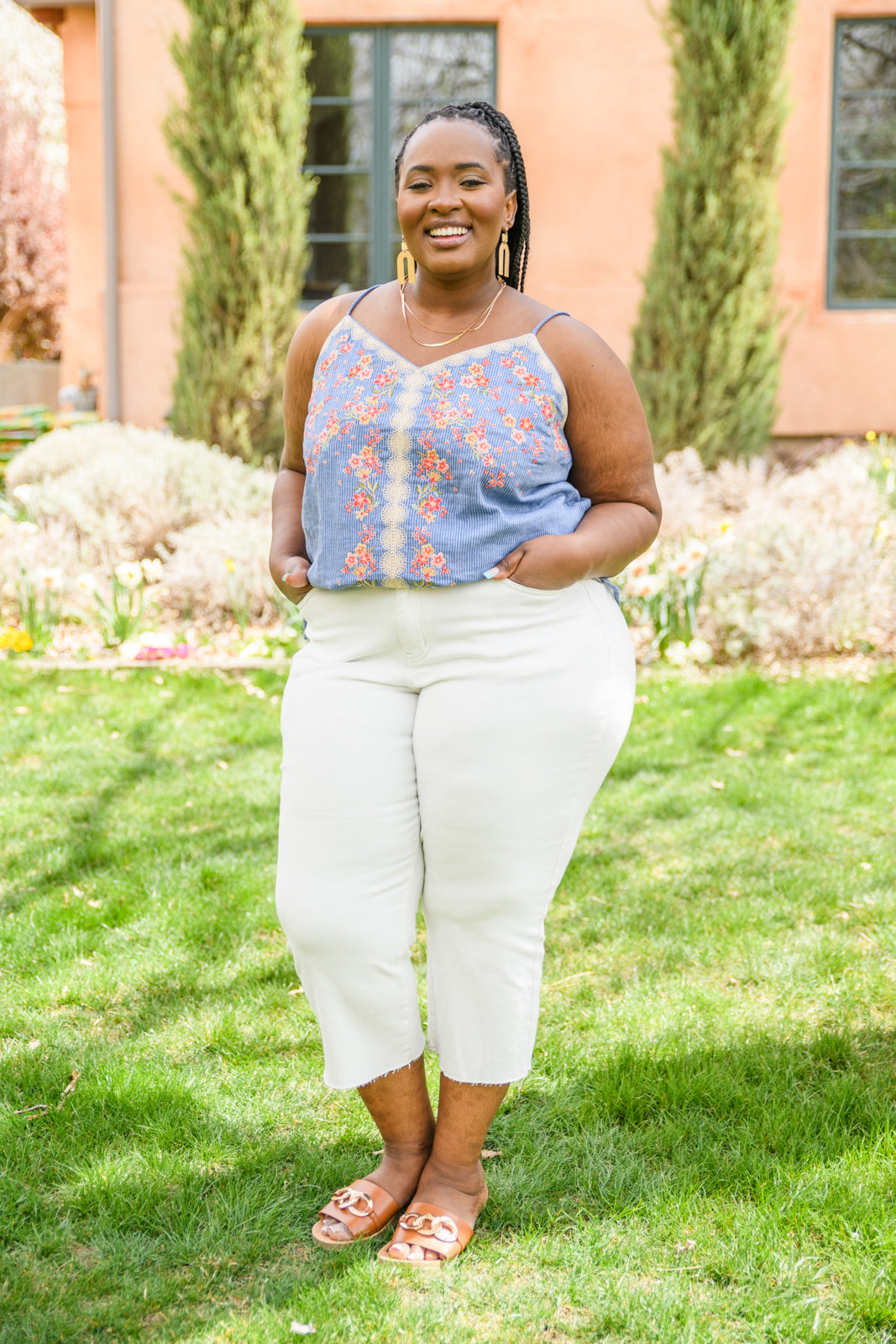 The Take Me To Greece Tank is an all-around winner! The subtle pinstripe fabric is embroidered with gorgeous flowers and a lace-like design. Pair with white jeans or your favorite pair of shorts and stay cool this summer!