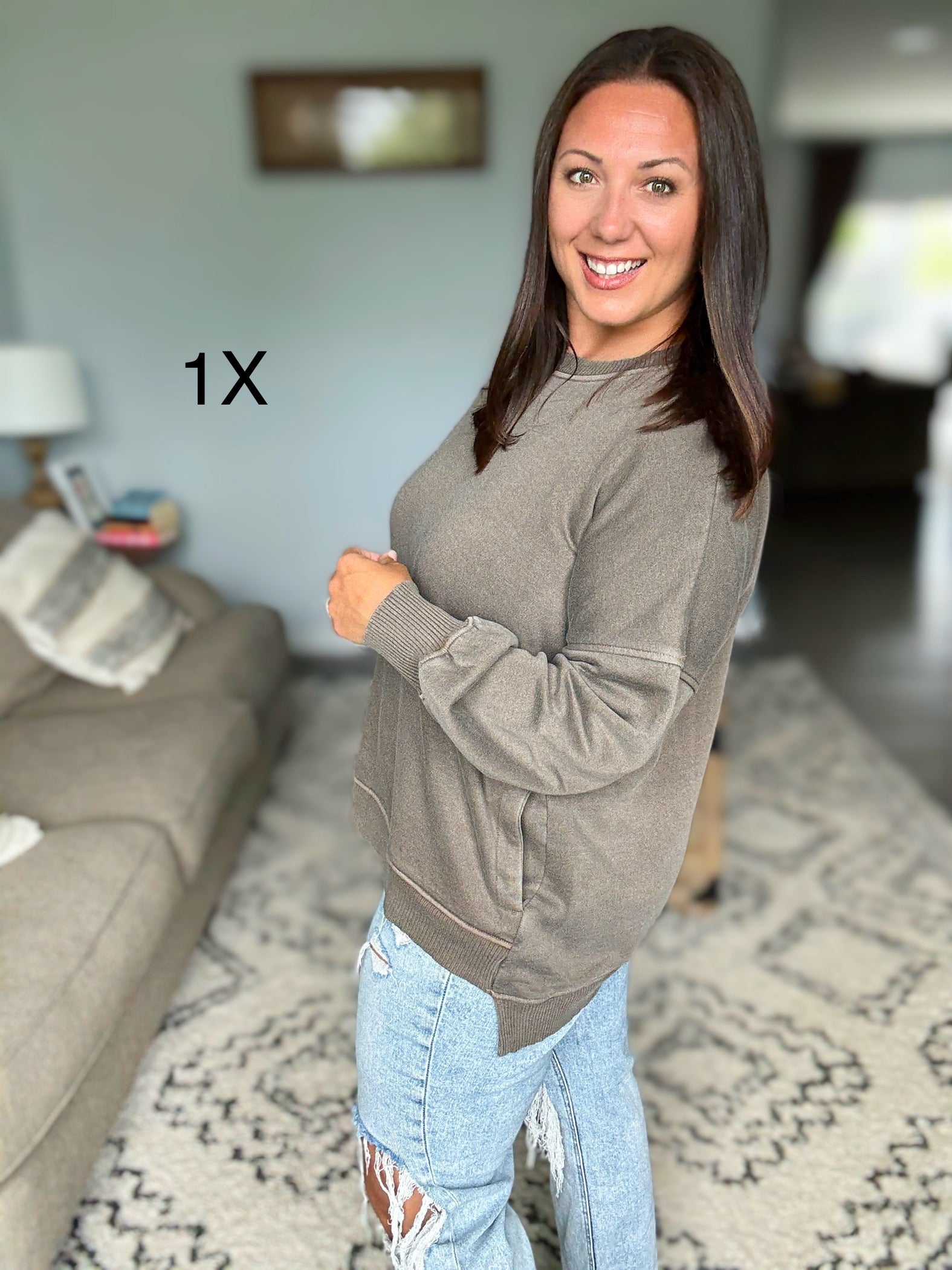 Soft, stretchy, and effortlessly chic — this Talk Cozy to Me Stepped Hem pullover has all the cozy details you crave. A ribbed round neckline, dropped shoulders, and banded cuffs create a relaxed silhouette, while functional side pockets and a stepped hemline keep it practical and polished.