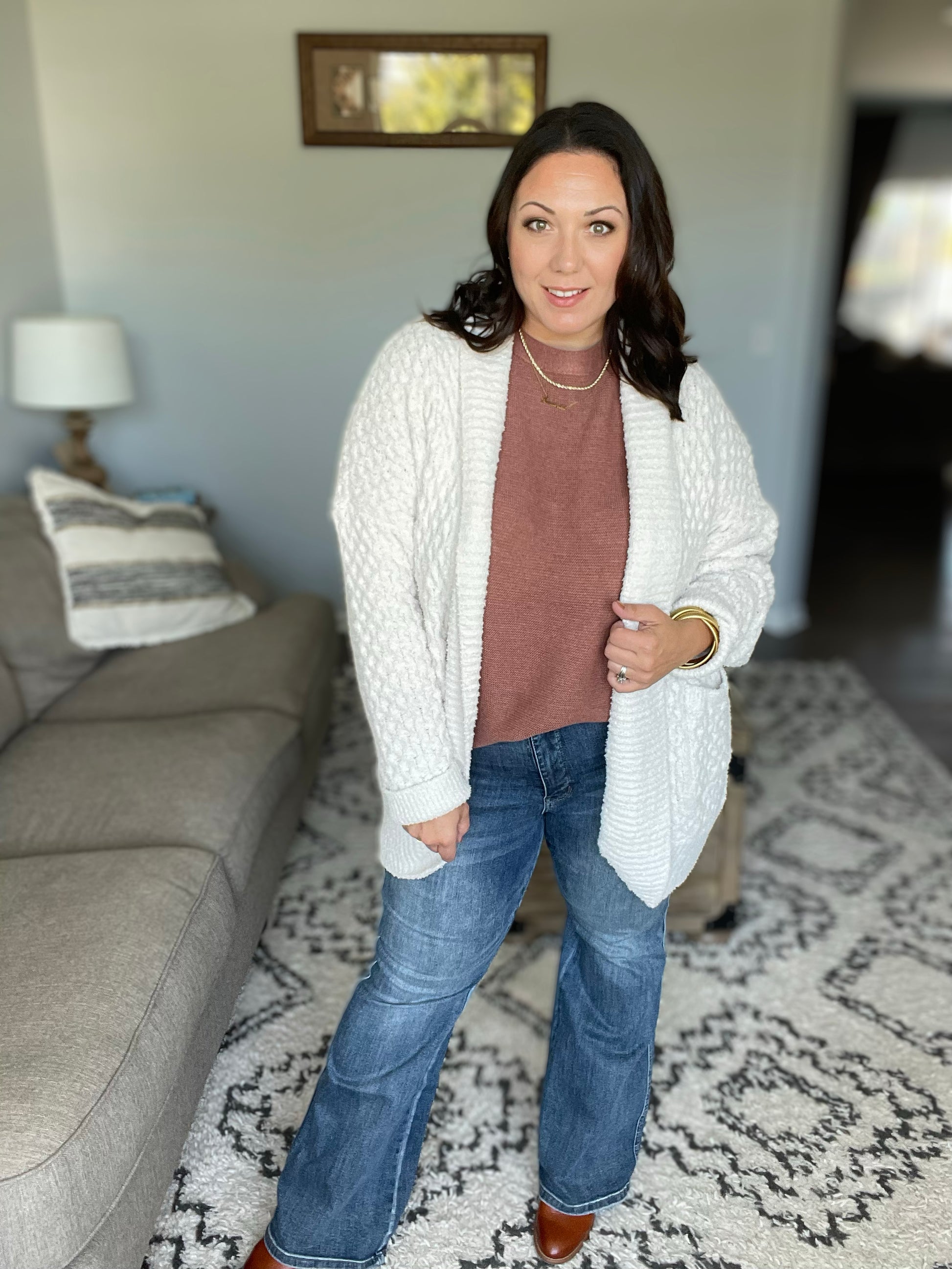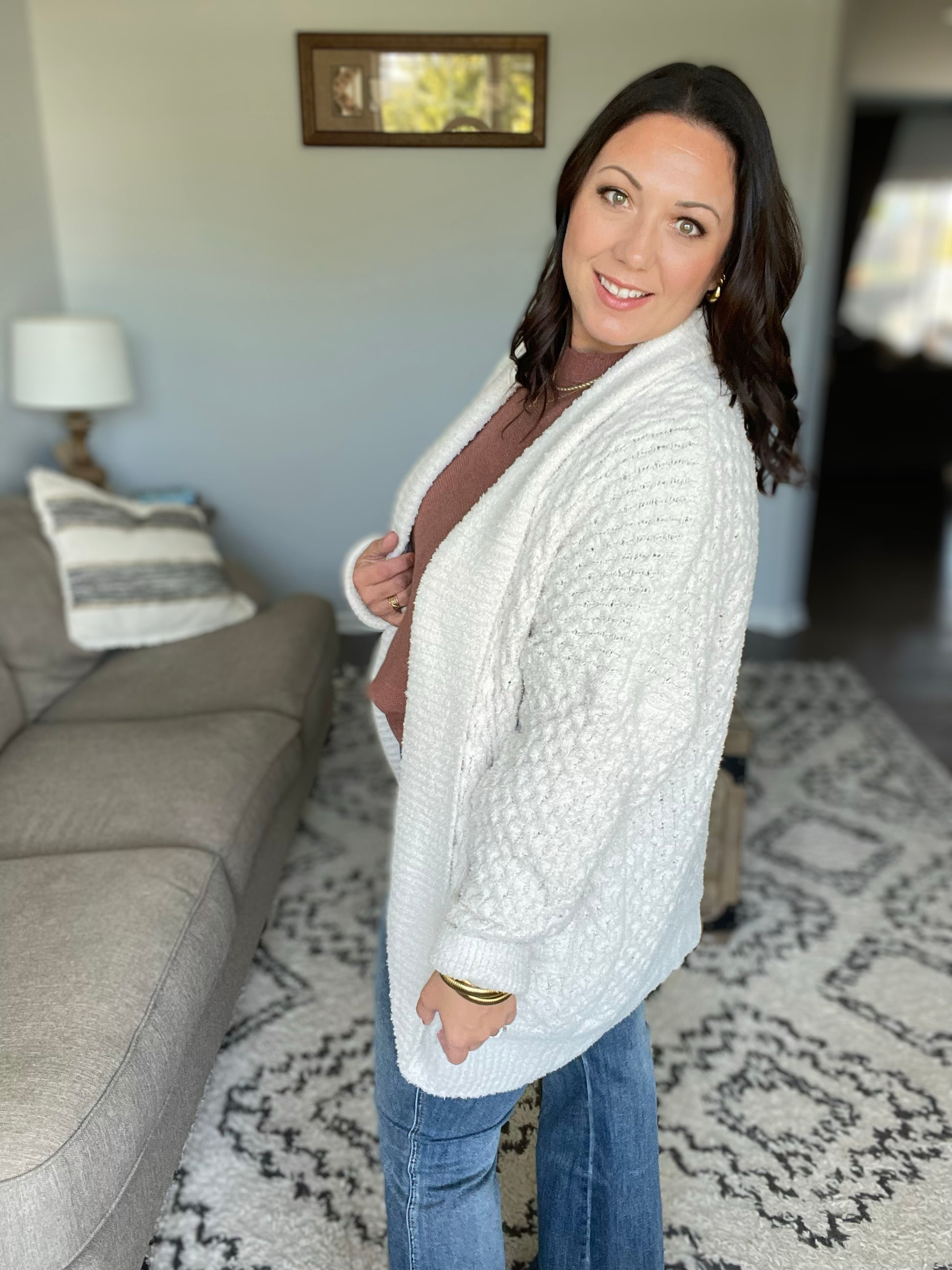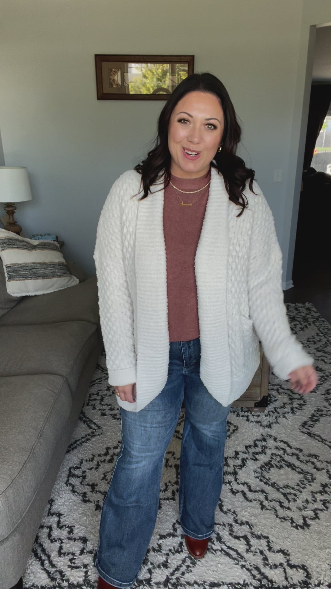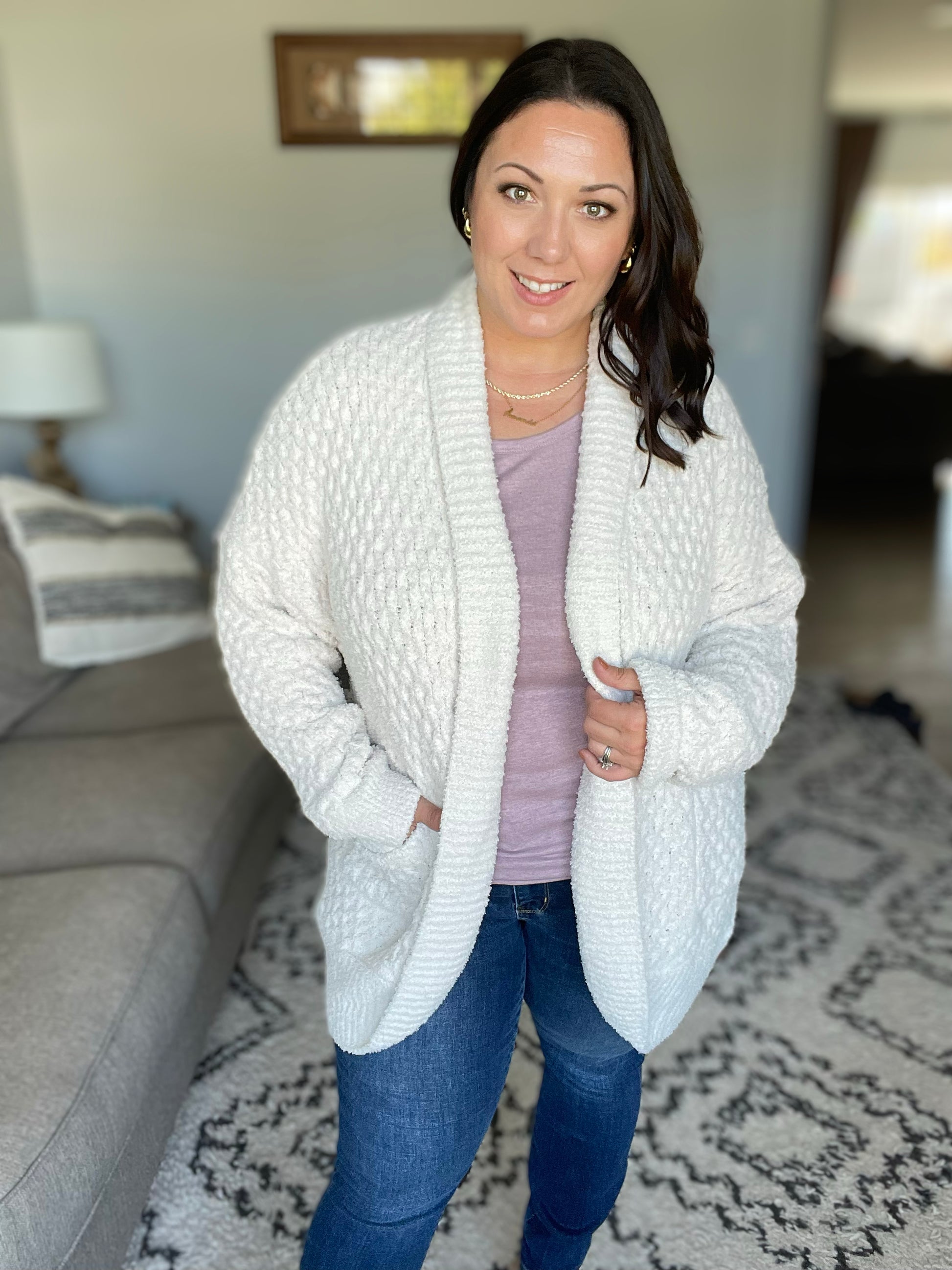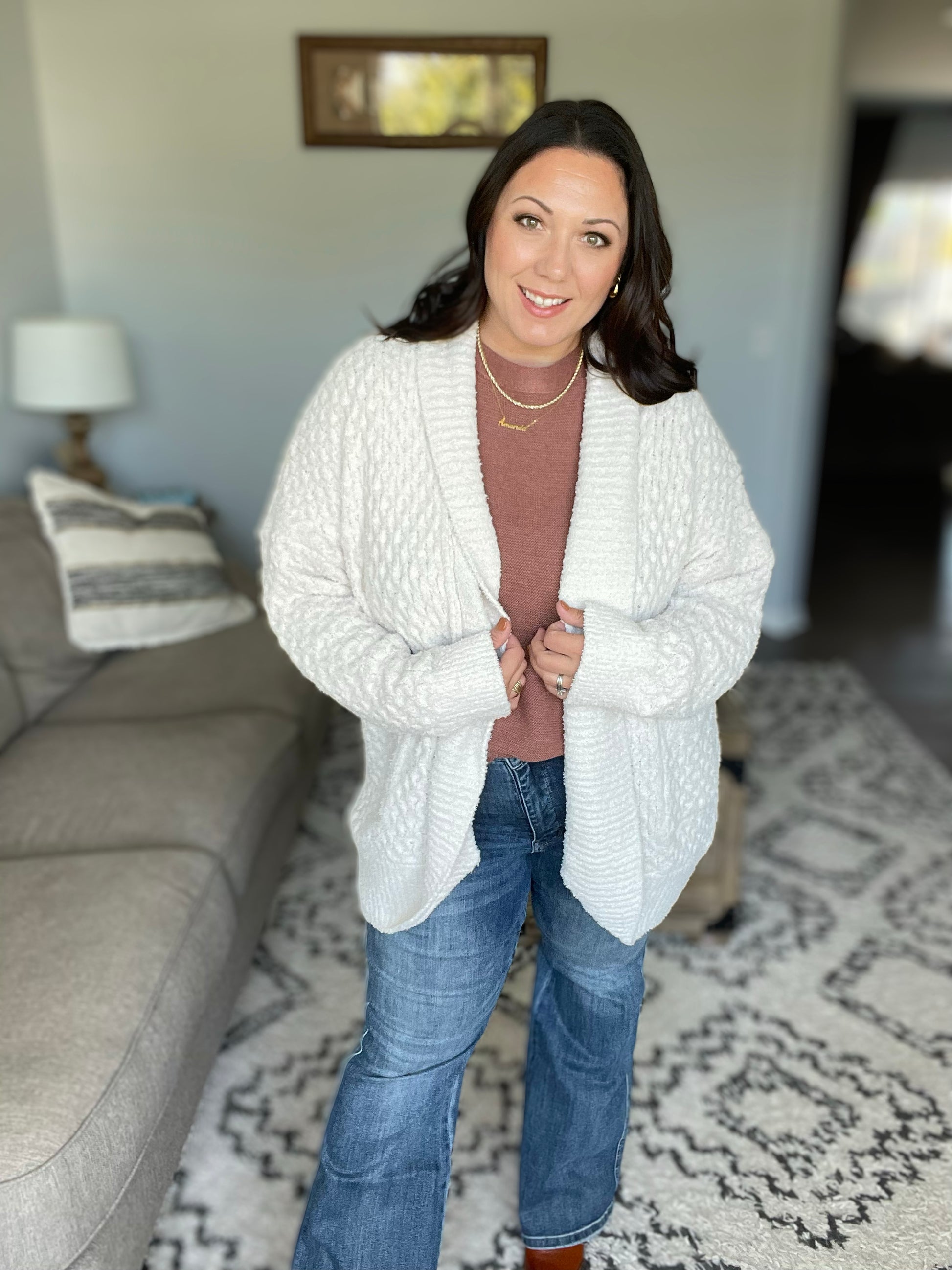 Stay cozy and stylish with our Tell Me Your Dreams Cardigan. Made from super soft sweater knit, the shawl collar and dropped shoulder offer a relaxed and comfortable fit. Complete with pockets, ribbed cuffs and hem, and an open front, this longline silhouette is perfect for any occasion.