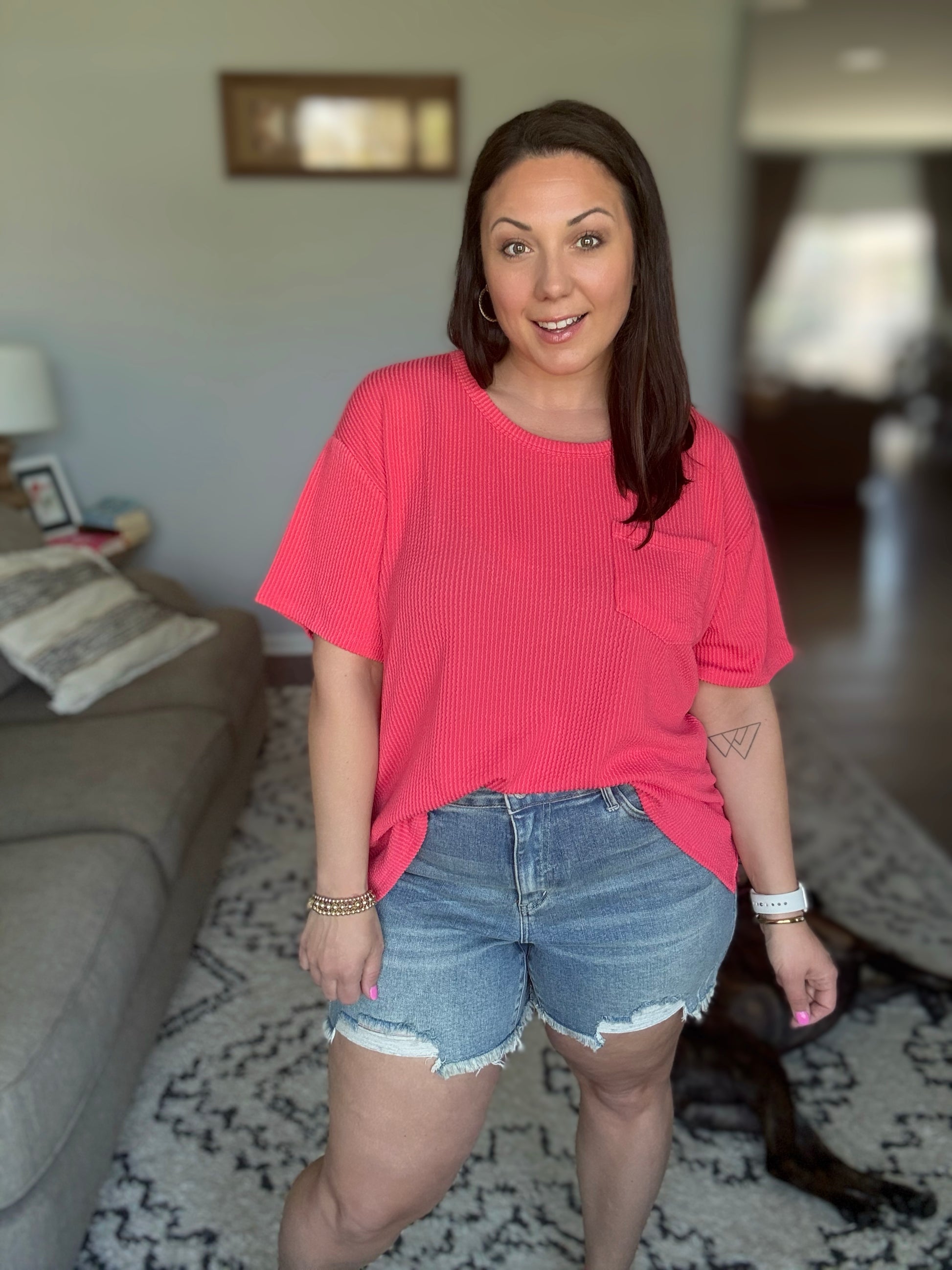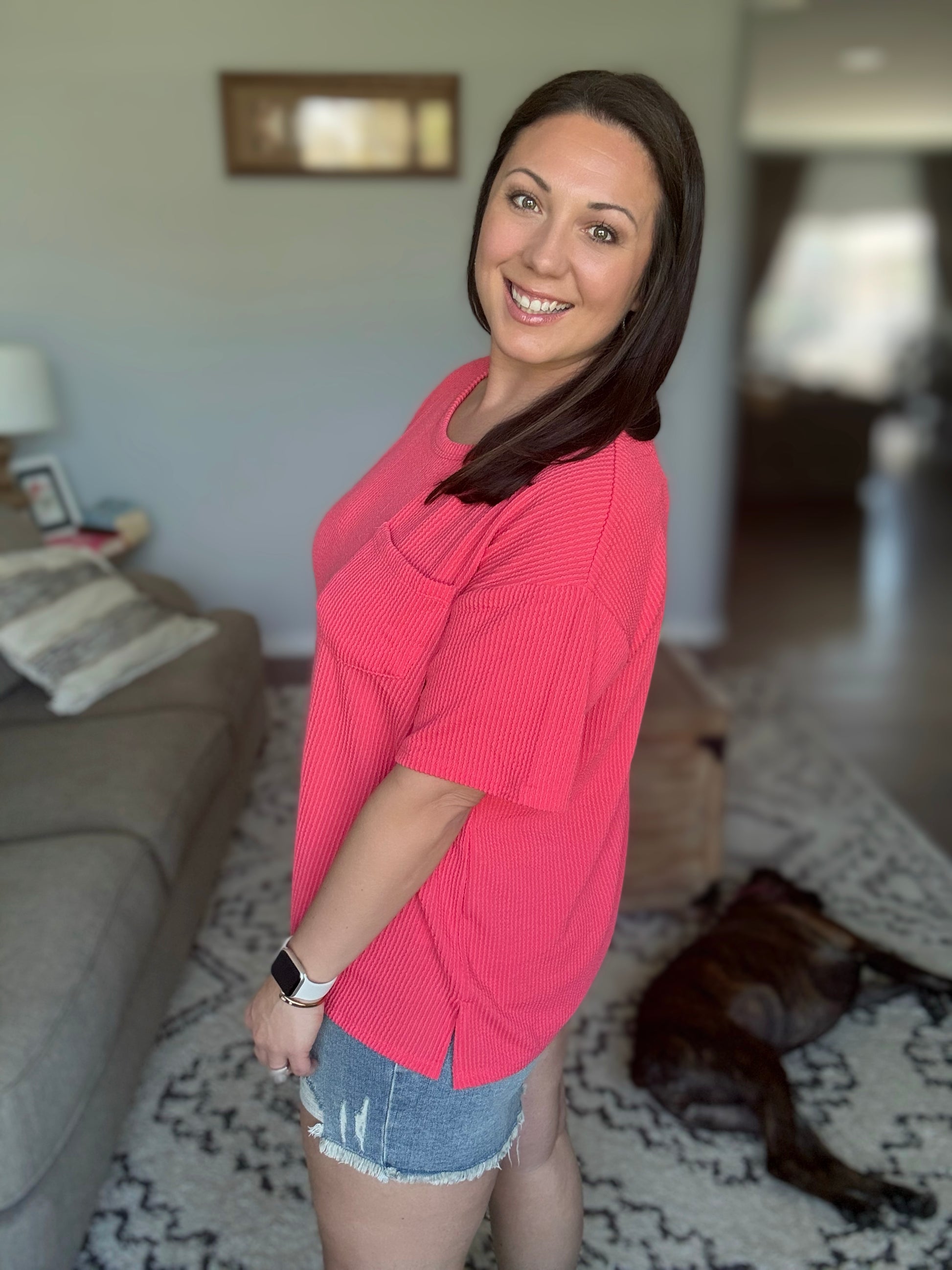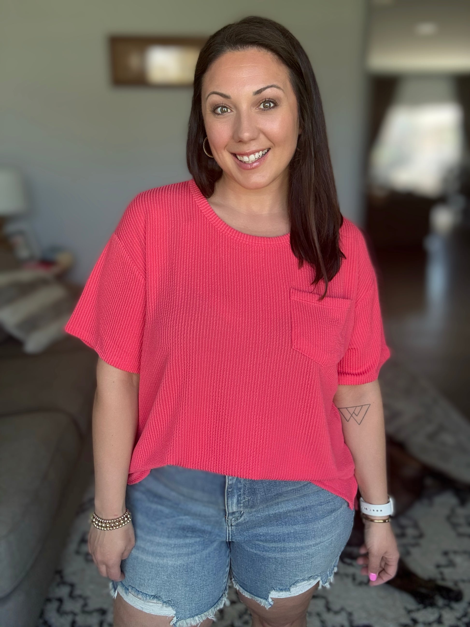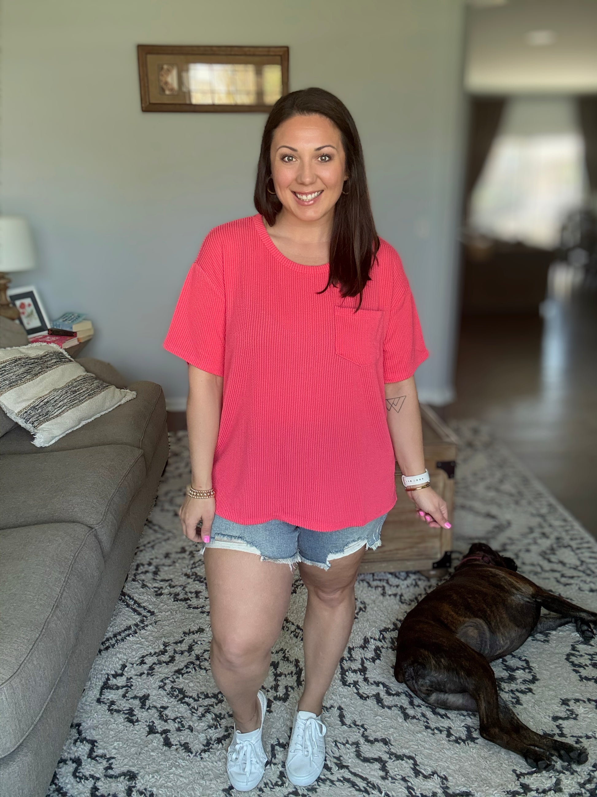 Get ready to make a statement this summer with The Go-To Tee in Summer Coral! Made from a lightweight cable ribbed knit, this tee features a banded round neckline, a patch pocket, and side slits for added style. And with a fun center back seam, you'll be turning heads wherever you go.