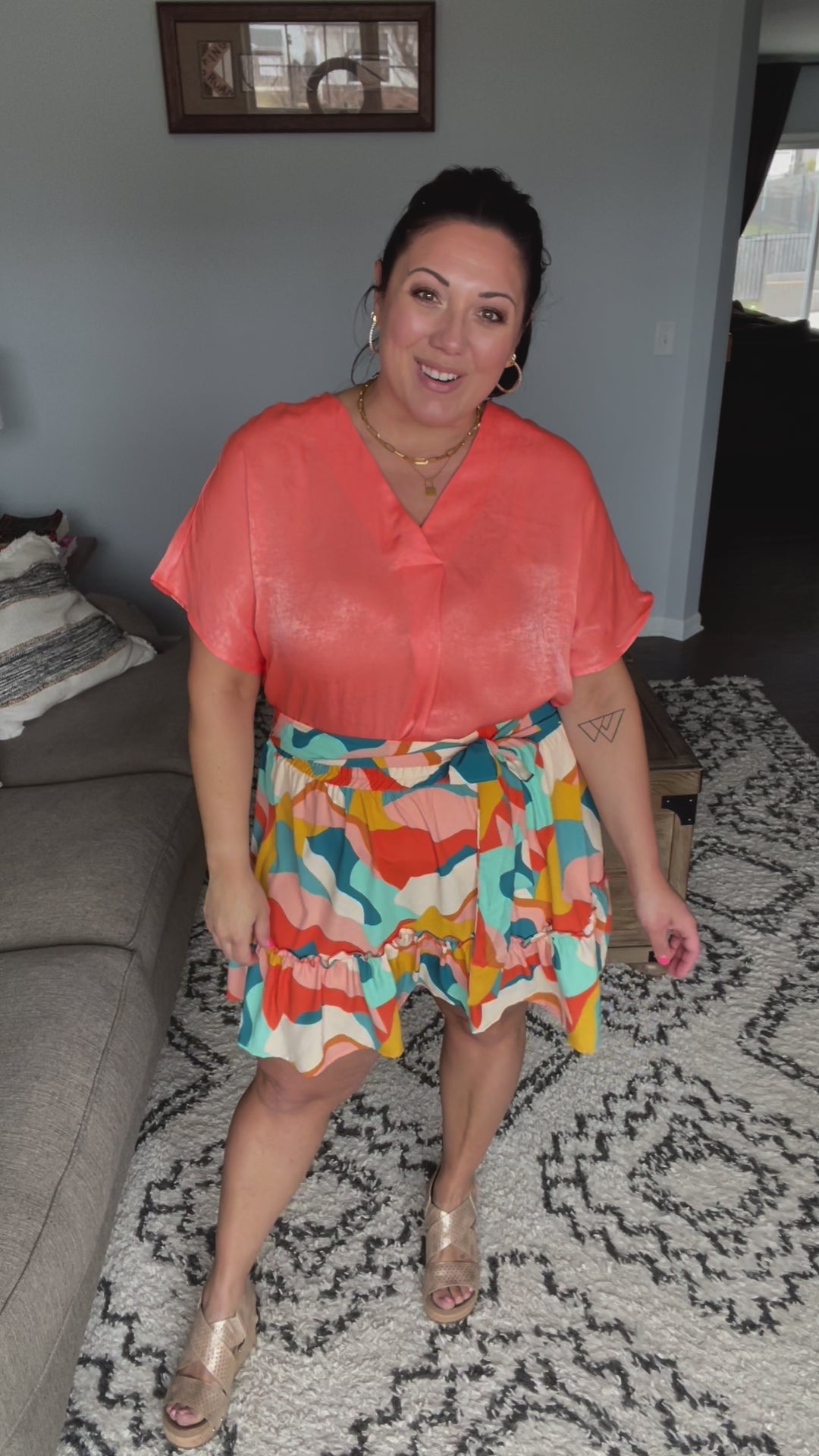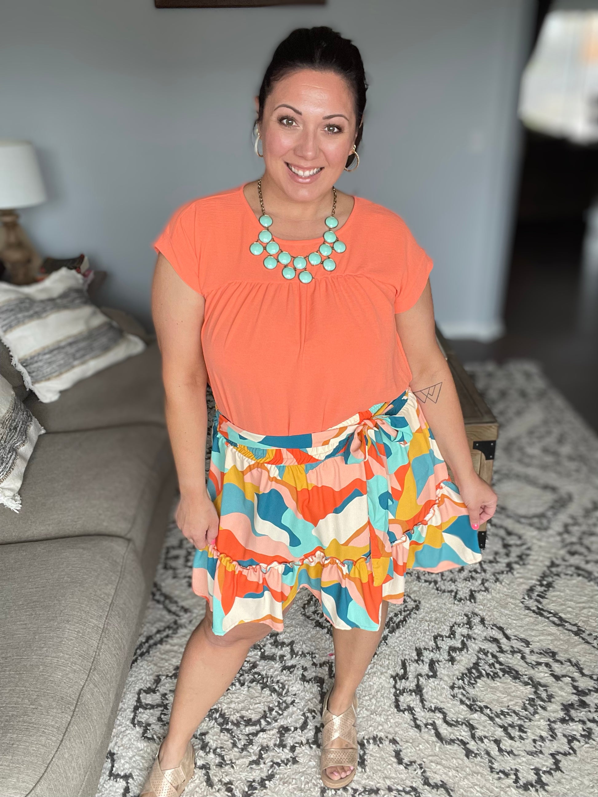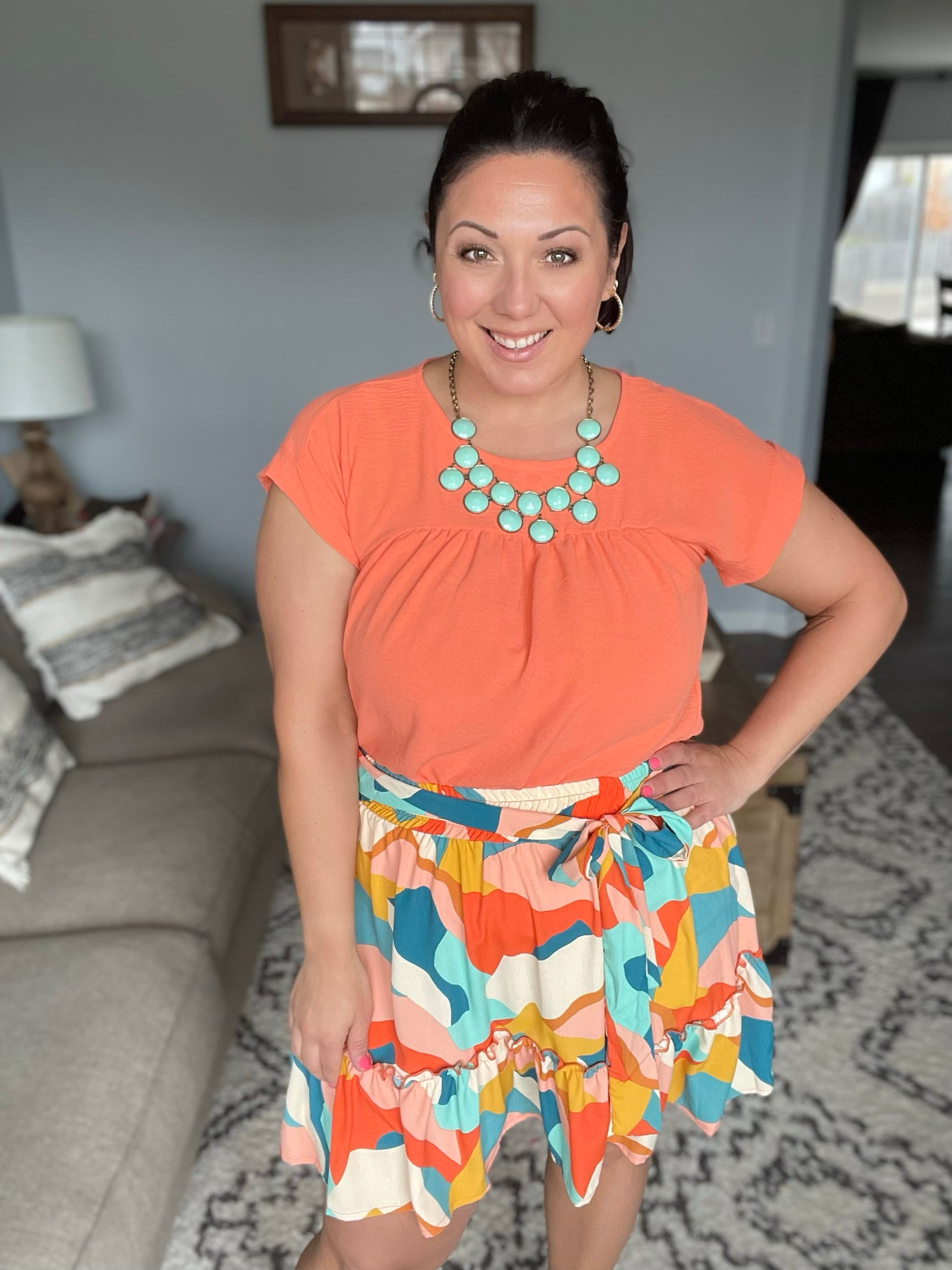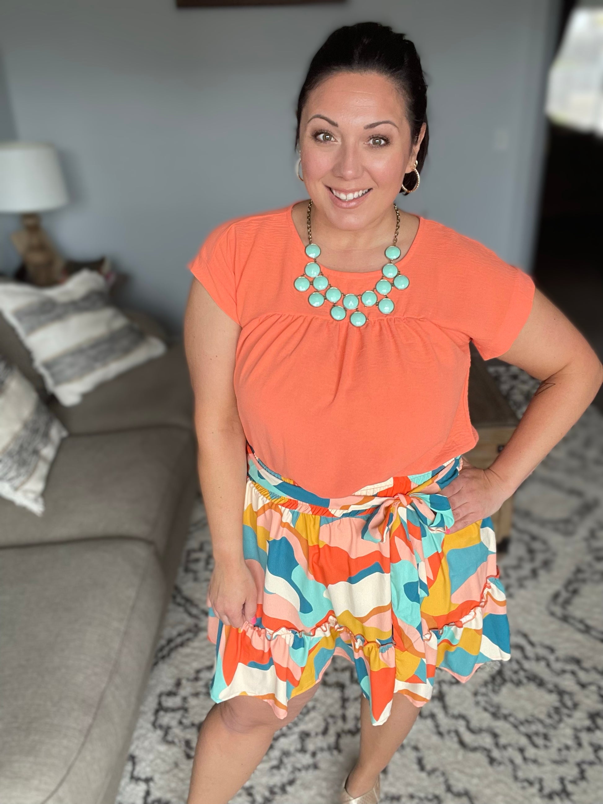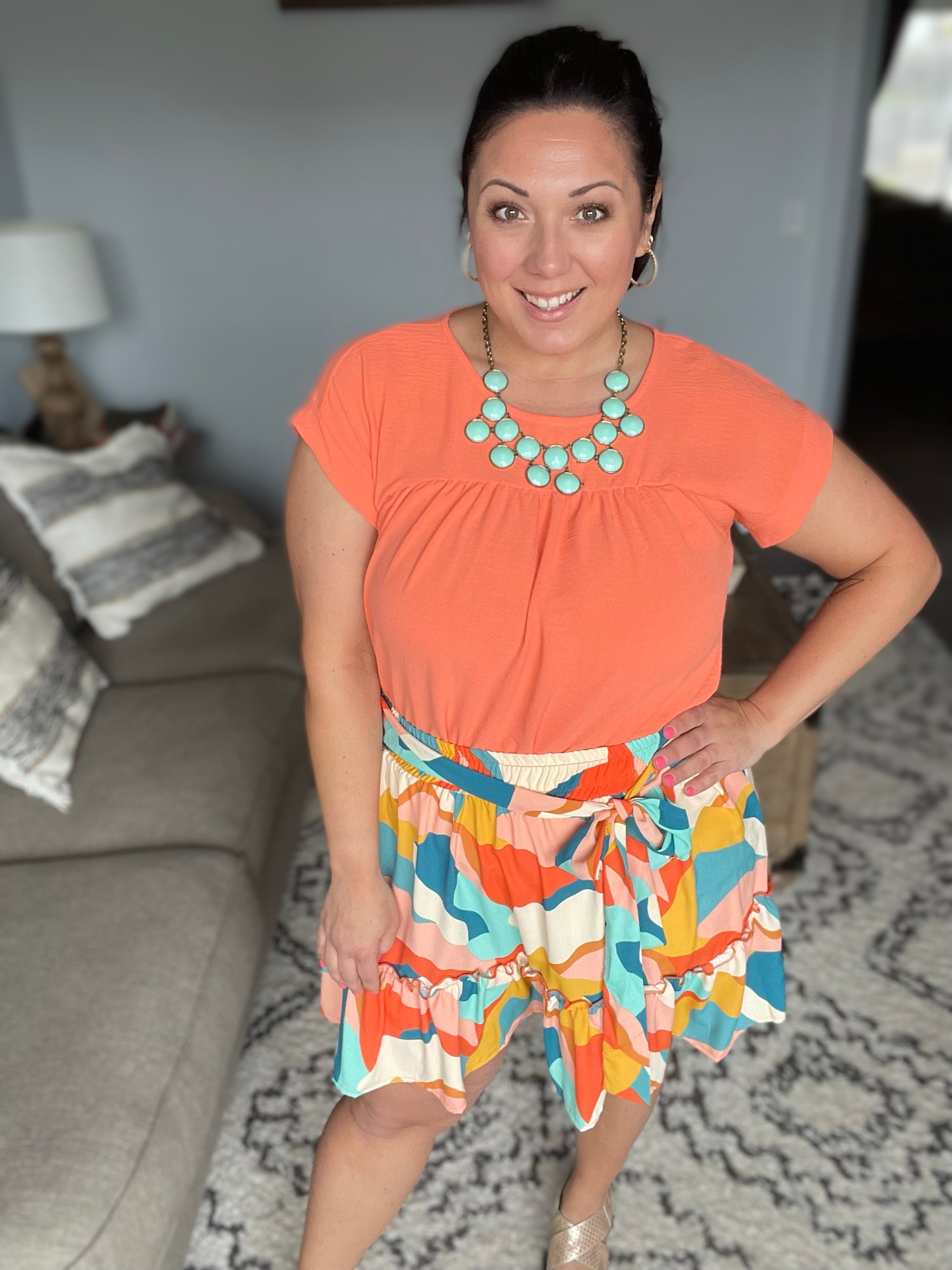 Introducing our They Can't Help but Stare Tiered Mini Skirt - perfect for making a statement! The lightweight woven fabric and sewn "half" belt add a touch of elegance and the shorts liner provides comfort and coverage in case of a "peek-a-boo" incident. The tiered design elevates your style, while the abstract geometric print and vibrant color combo makes it a unique, head-turning piece.