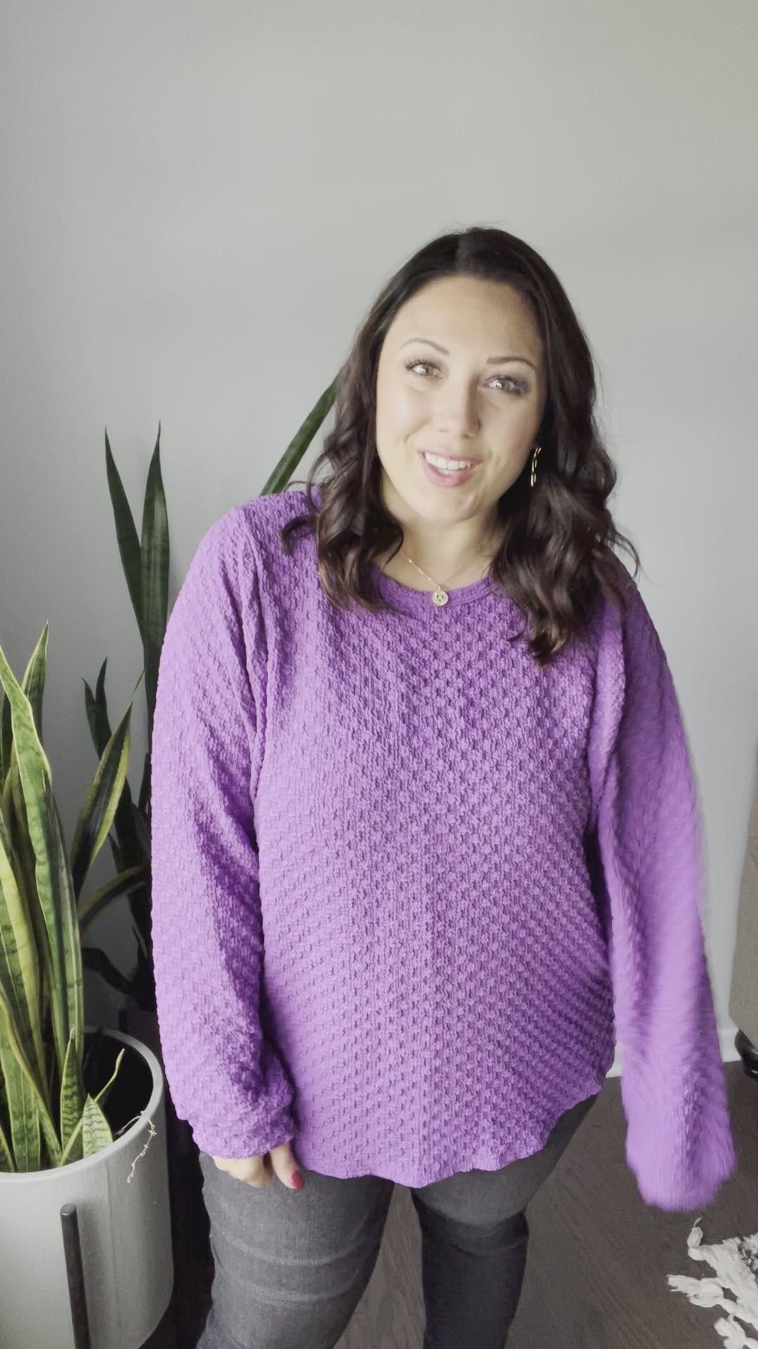 This Textured Royal Purple Pullover is a perfect way to add texture to your look. The textured checkered pattern fabric offers a relaxed fit with a round neckline. Enjoy ultimate comfort in this stylish piece.
