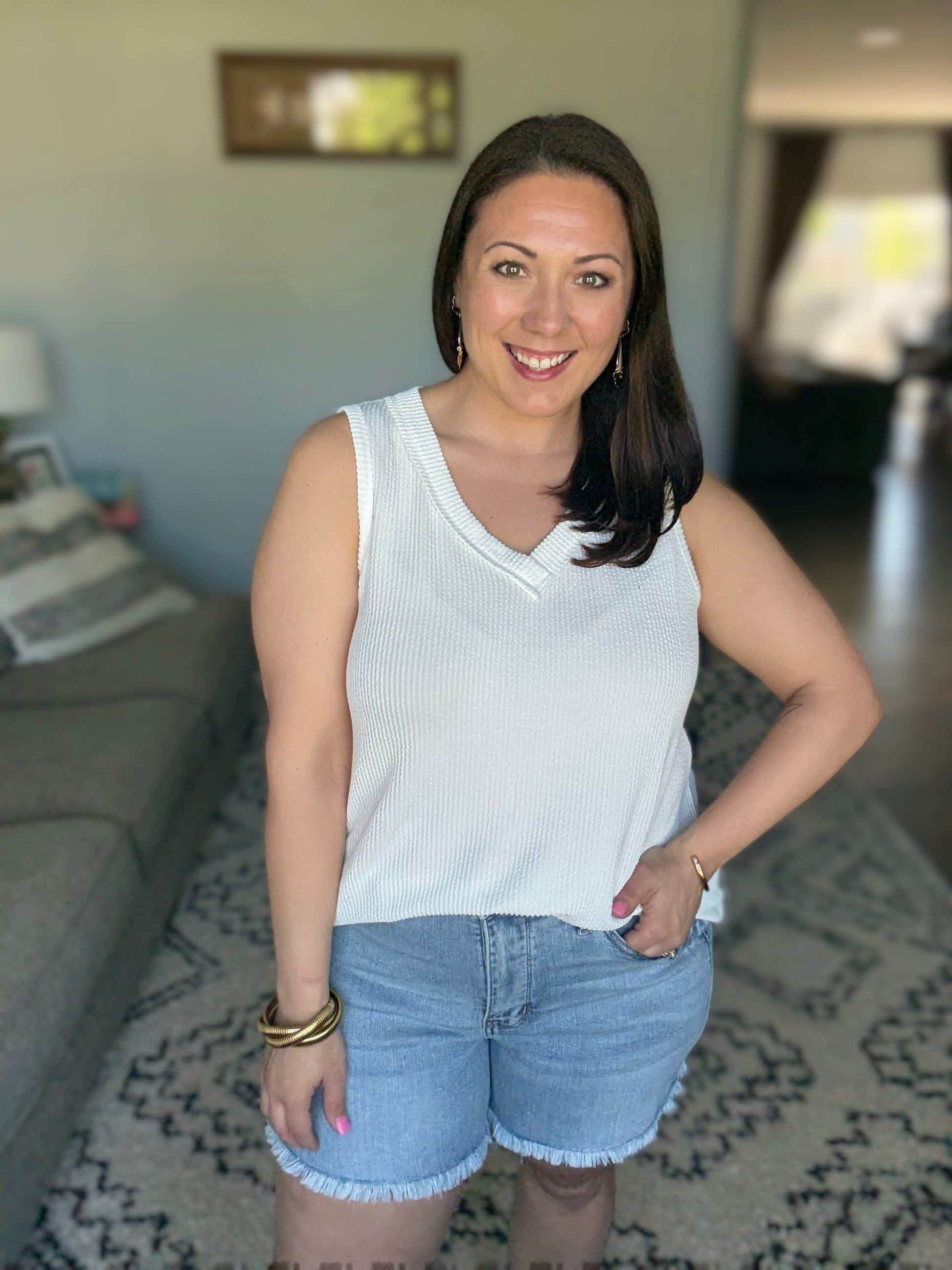Soft texture and thoughtful details make the Thread Lightly Ribbed Knit Tank a standout staple. Made from a lightweight cable ribbed knit, it features a banded, crossed V-neckline for a flattering touch. Exposed seam accents and a center back seam bring a subtle, modern edge to its easygoing silhouette. Perfect for layering or wearing solo, this tank is your go-to for effortless, everyday style.