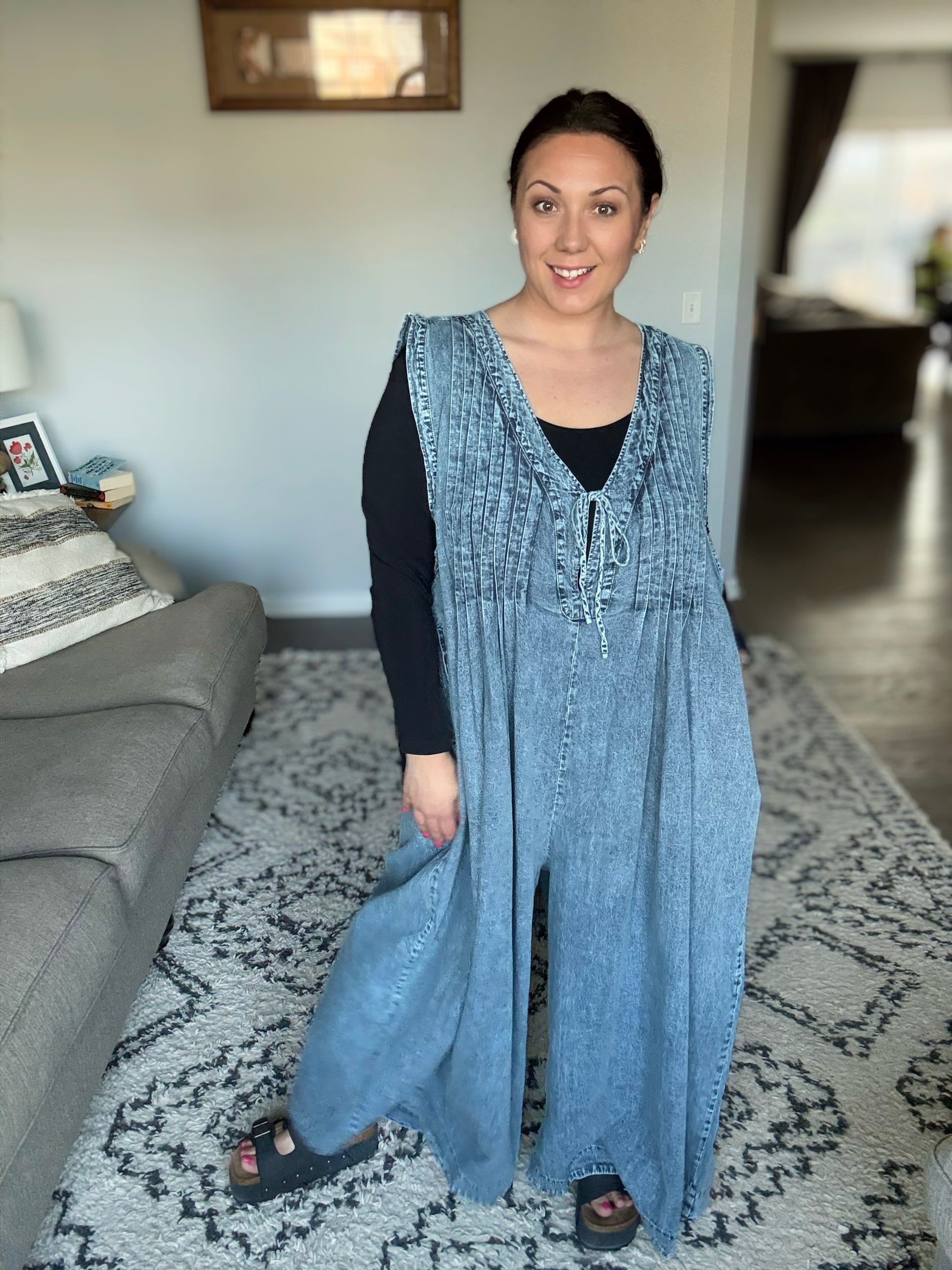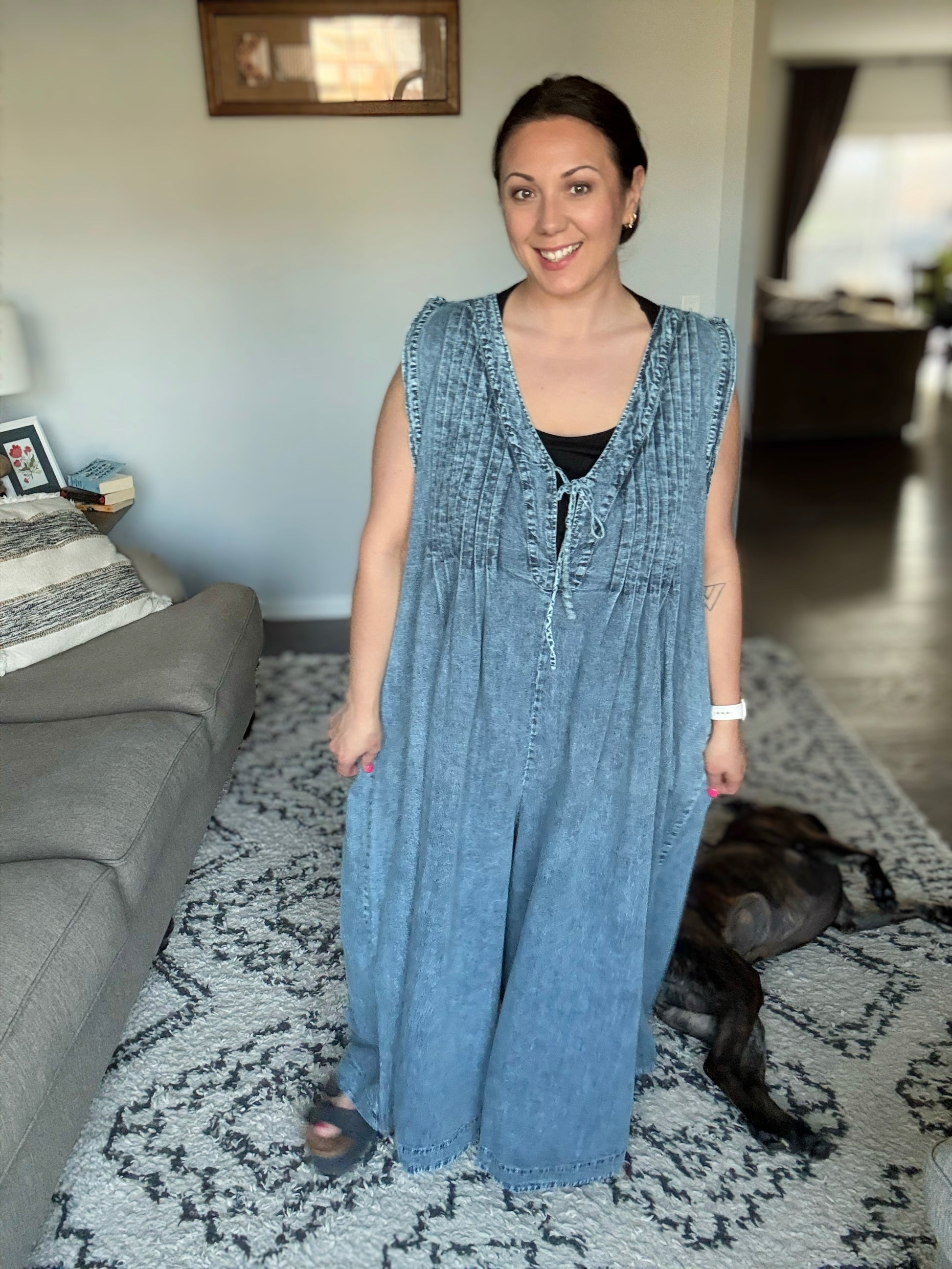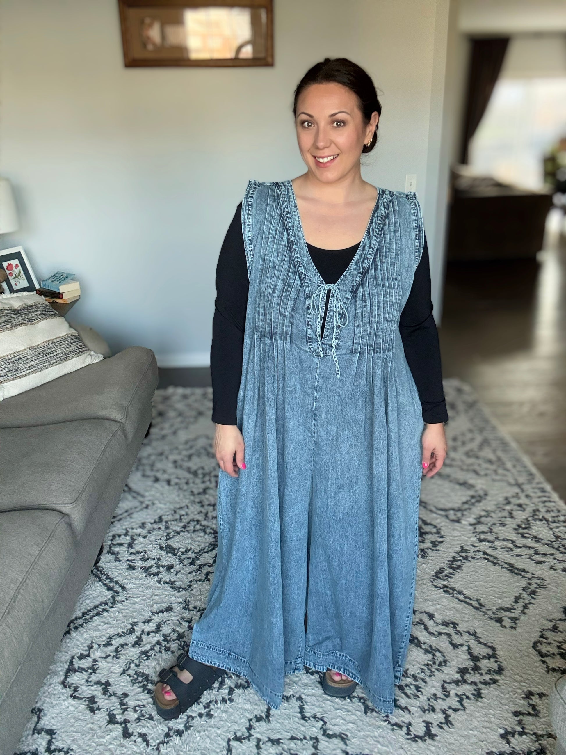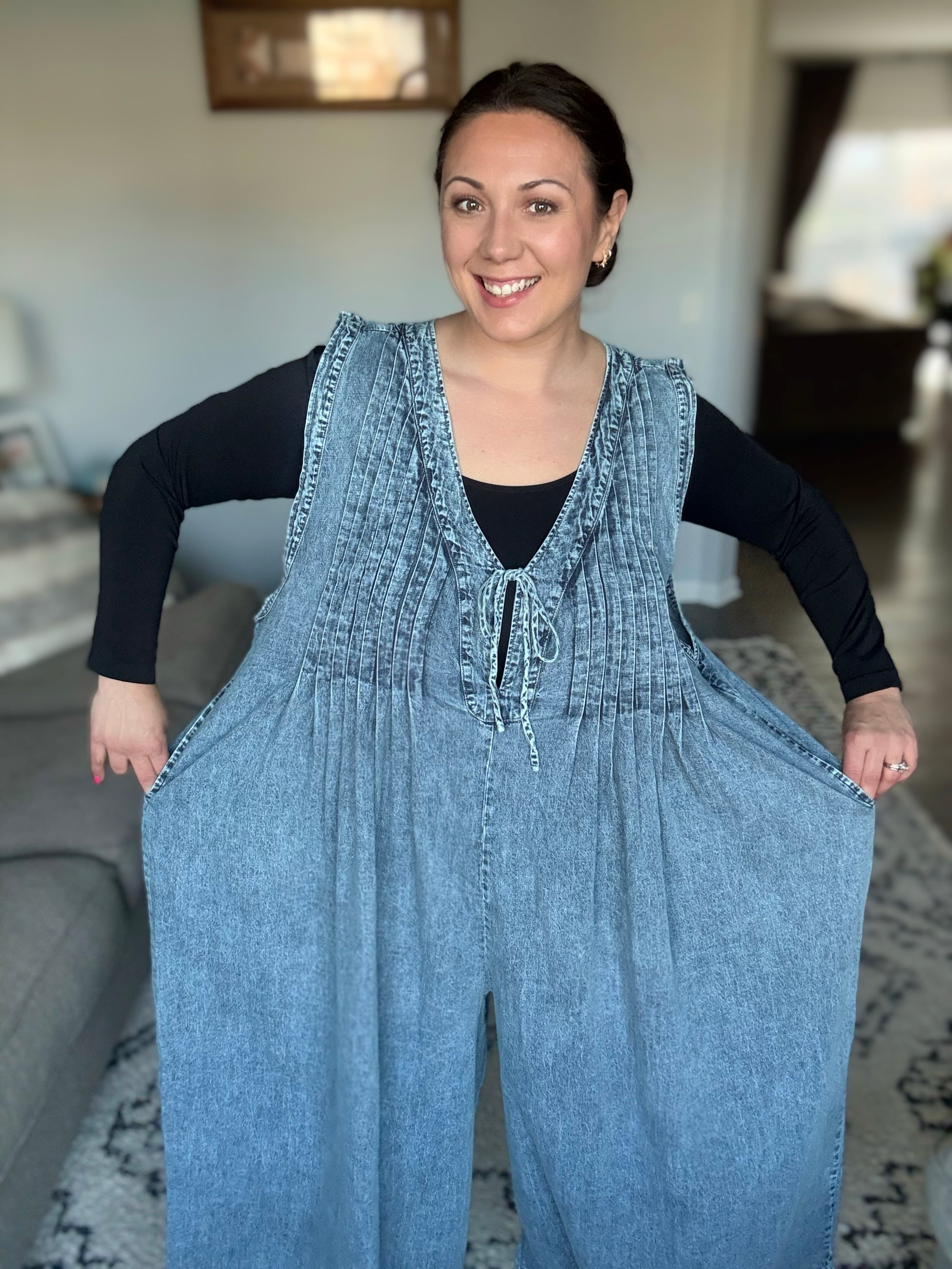 The Too Cool For Fools Wide Leg Jumpsuit is denim done right. Featuring a banded V-neck and chic pleat details, this jumpsuit serves up effortless style with a touch of edge. The functional neckline tie and blue side zipper add both form and function, while the barrel leg silhouette gives it a modern, laid-back vibe. Plus, with handy side pockets, you’ve got both style and convenience covered. Cool, confident, and undeniably chic — this jumpsuit is a total power move.