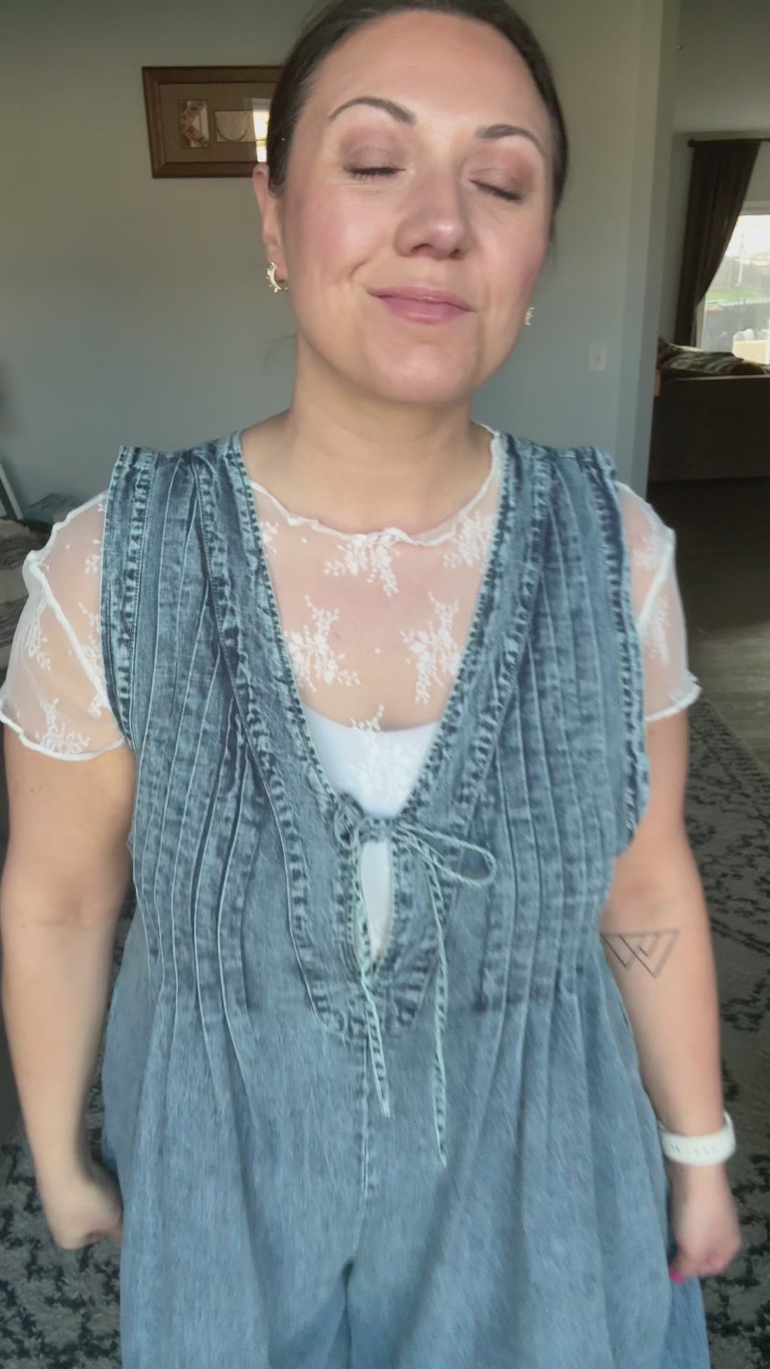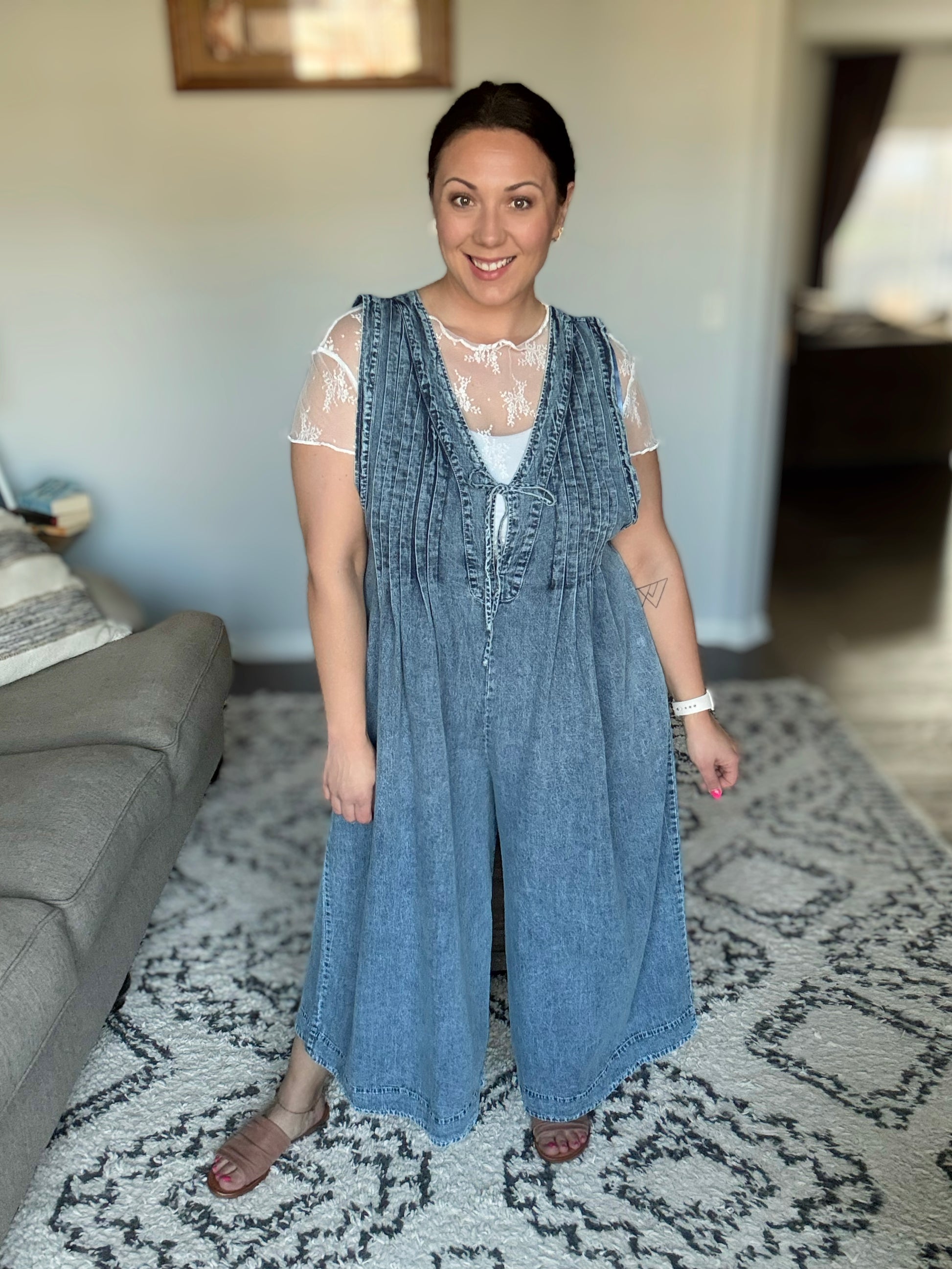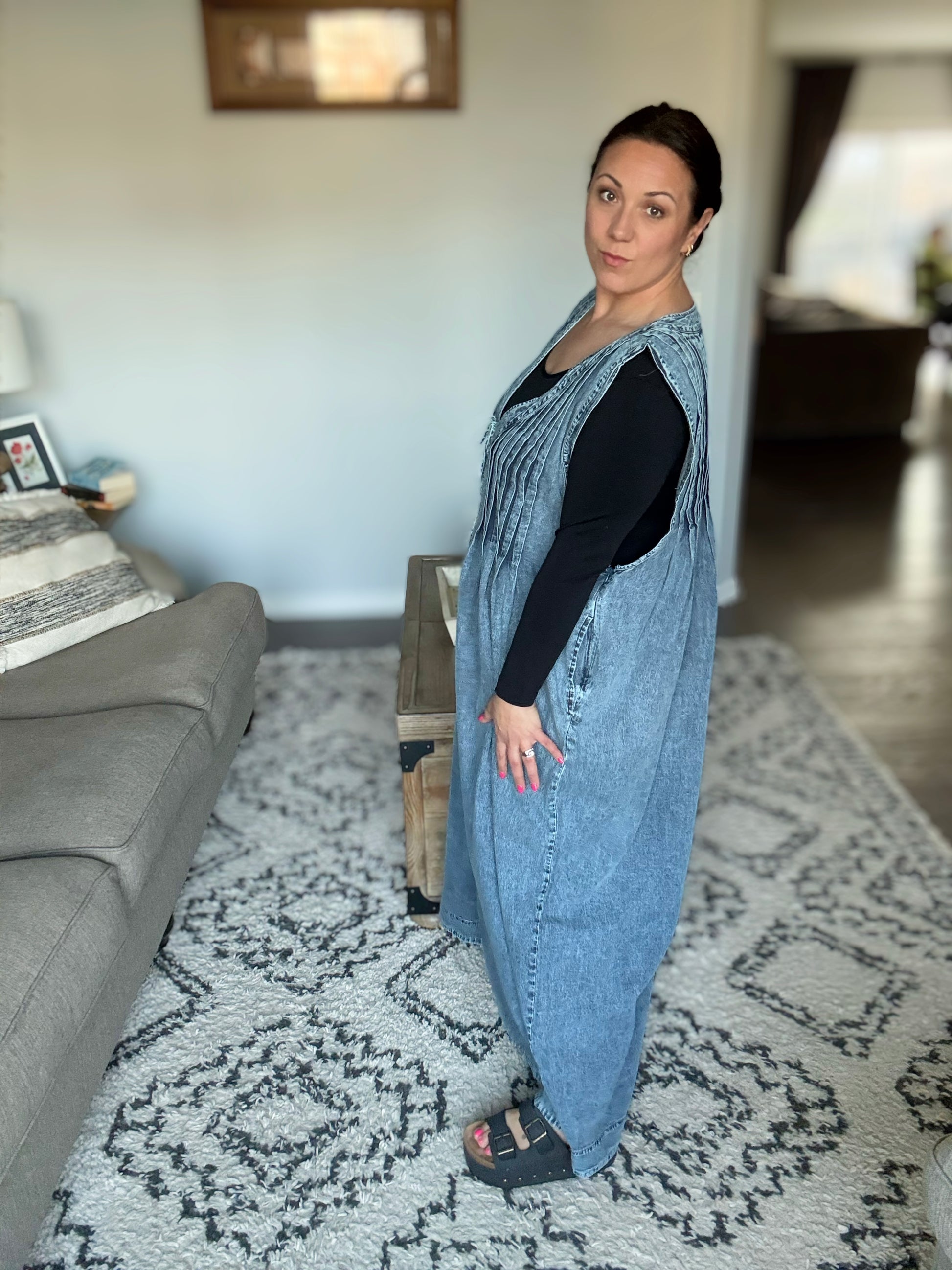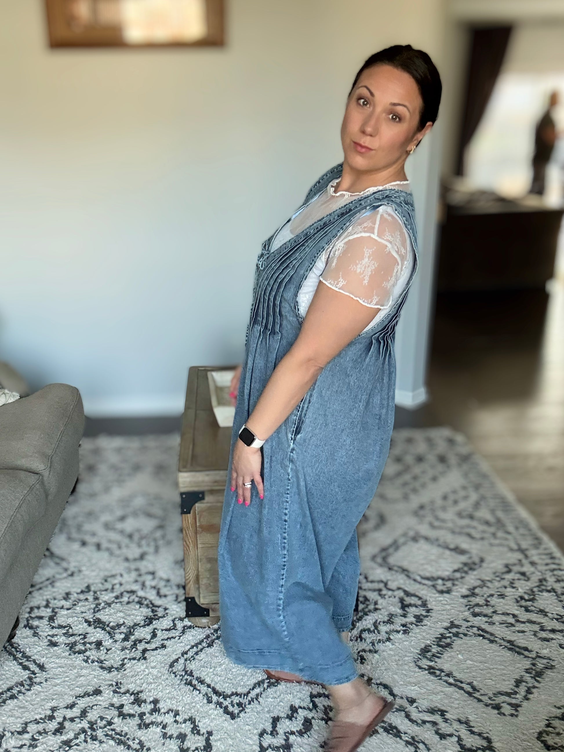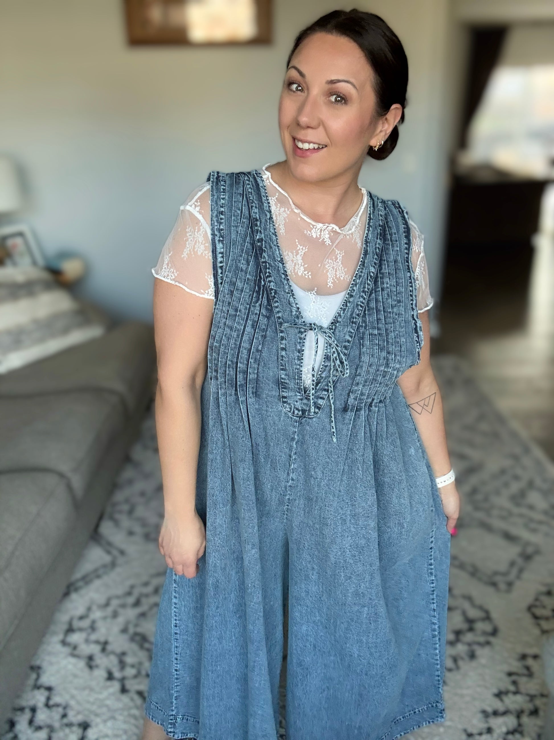 The Too Cool For Fools Wide Leg Jumpsuit is denim done right. Featuring a banded V-neck and chic pleat details, this jumpsuit serves up effortless style with a touch of edge. The functional neckline tie and blue side zipper add both form and function, while the barrel leg silhouette gives it a modern, laid-back vibe. Plus, with handy side pockets, you’ve got both style and convenience covered. Cool, confident, and undeniably chic — this jumpsuit is a total power move.