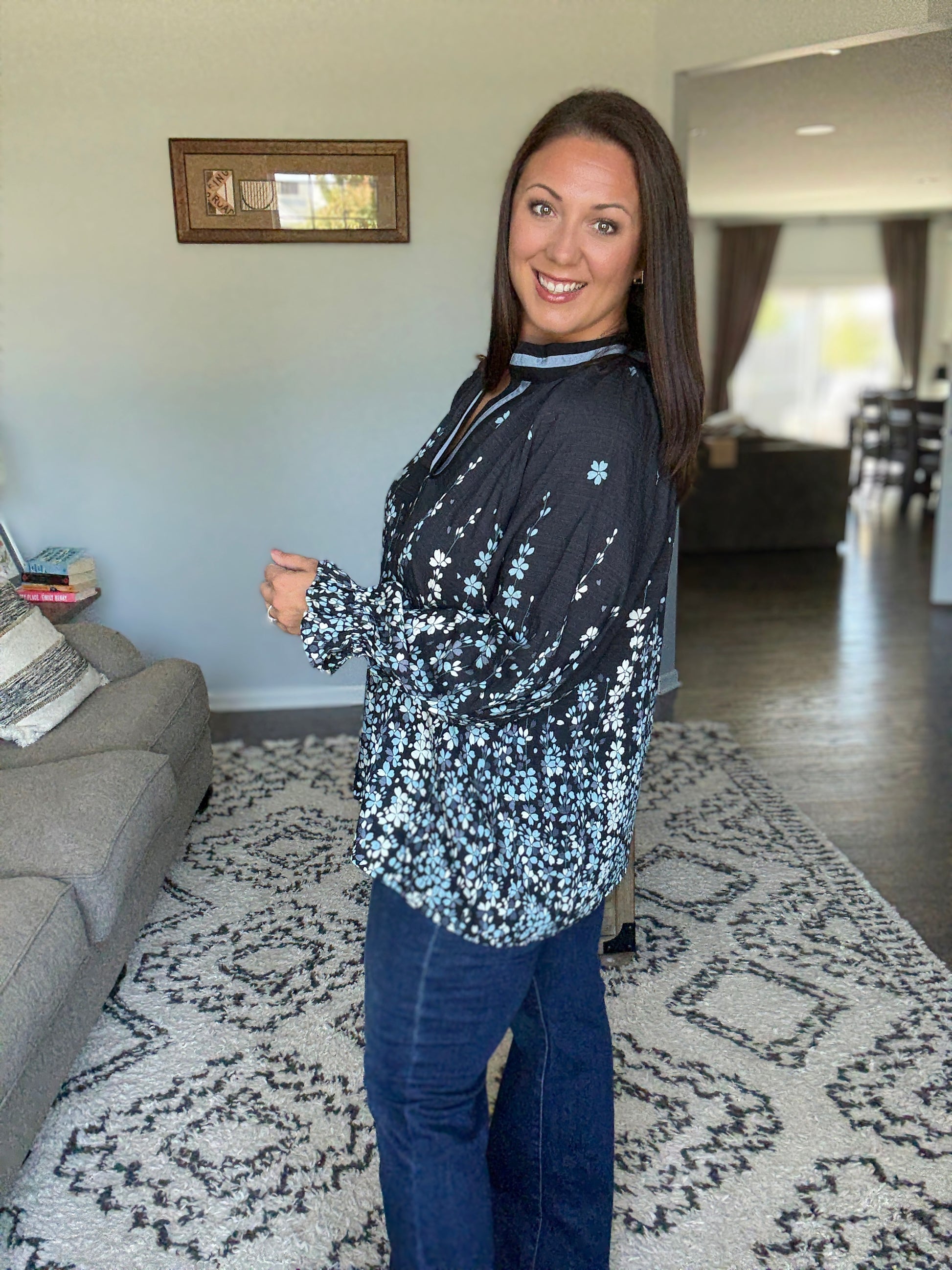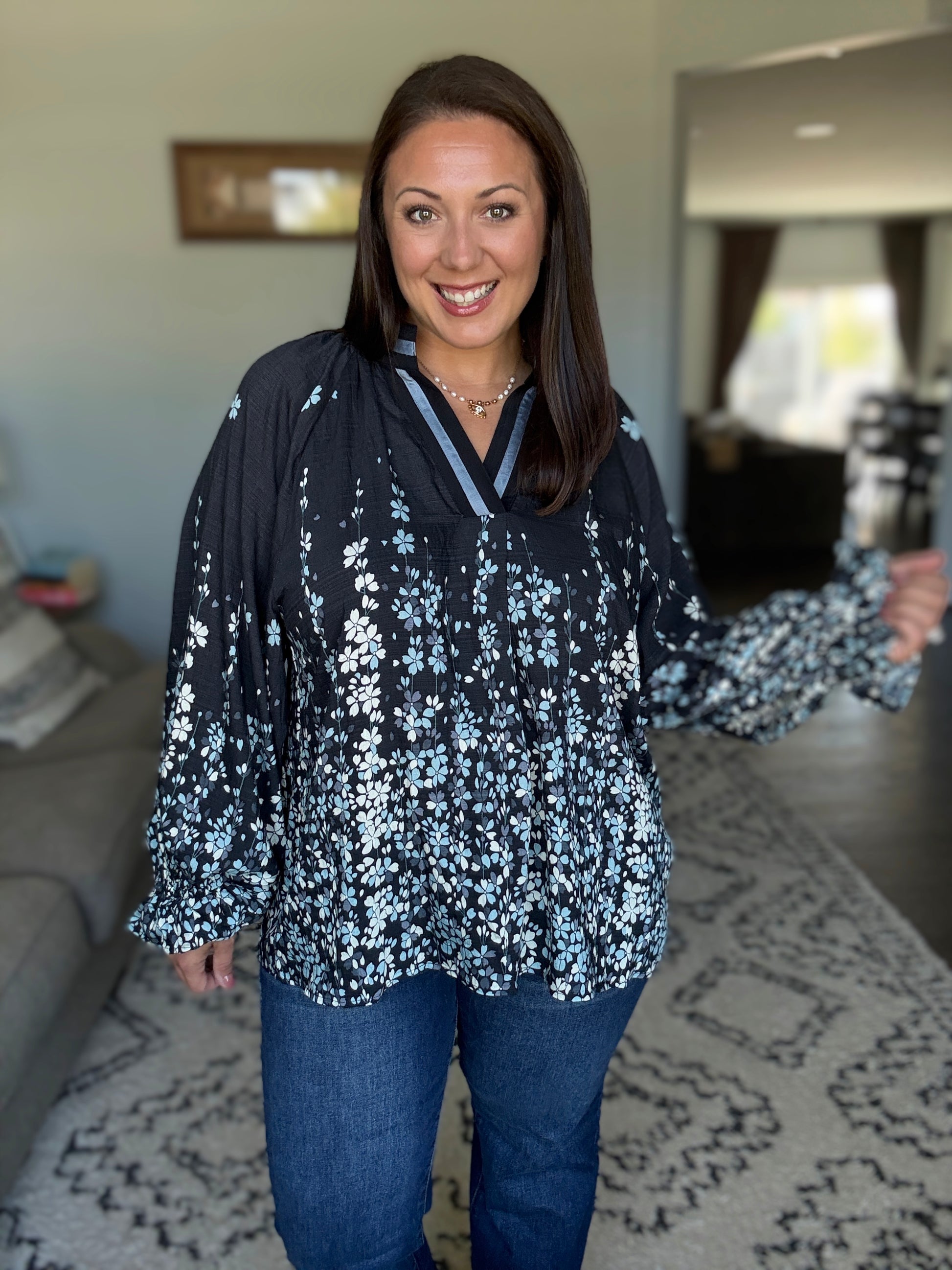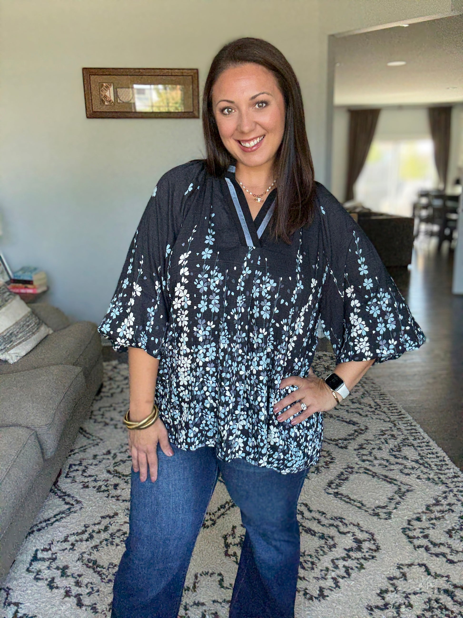 Umgee Full Size Floral Vine Print Blouse with Balloon Sleeves in Black