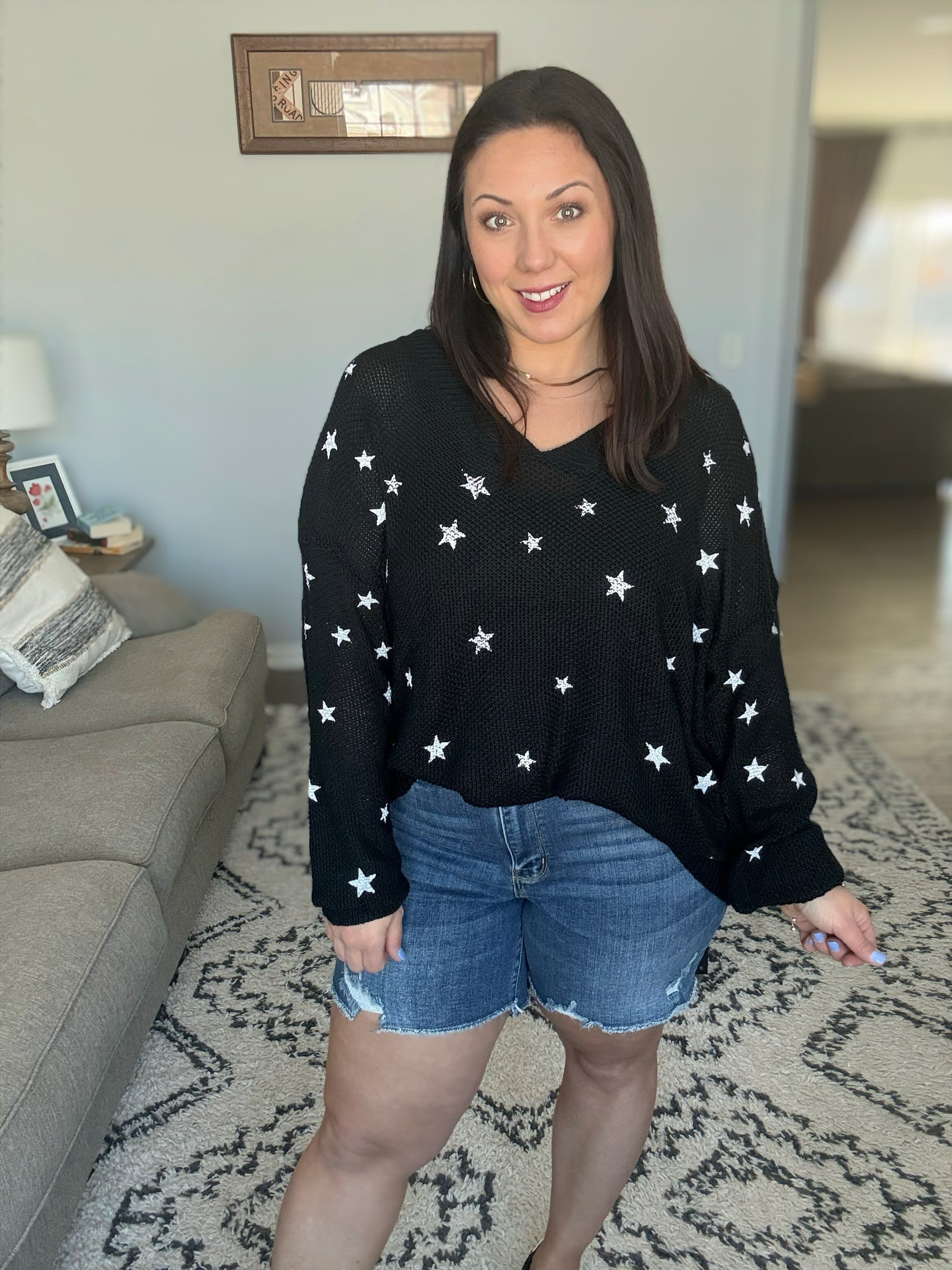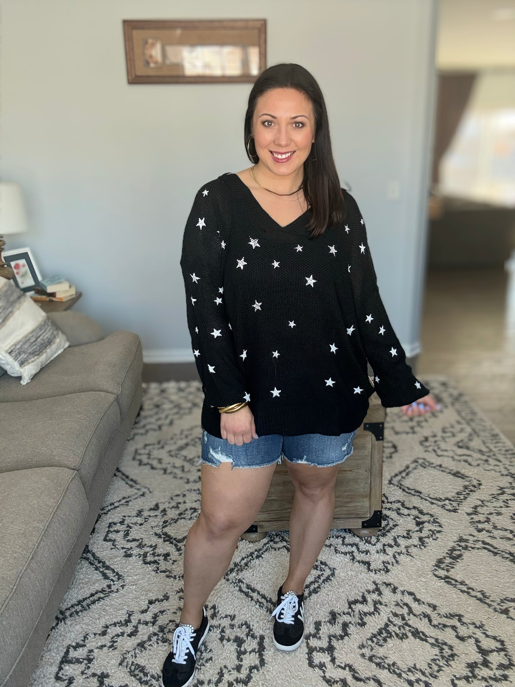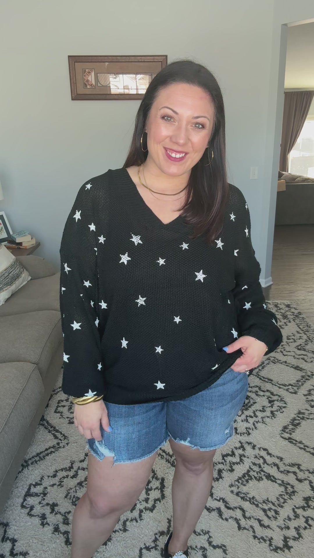 The Star V-Neck Long Sleeve Sweater is a stylish transition top Featuring a trendy star pattern, this loose knit, lightweight sweater adds a playful touch to any look. The V-neck design offers a flattering neckline that can be dressed up or down.