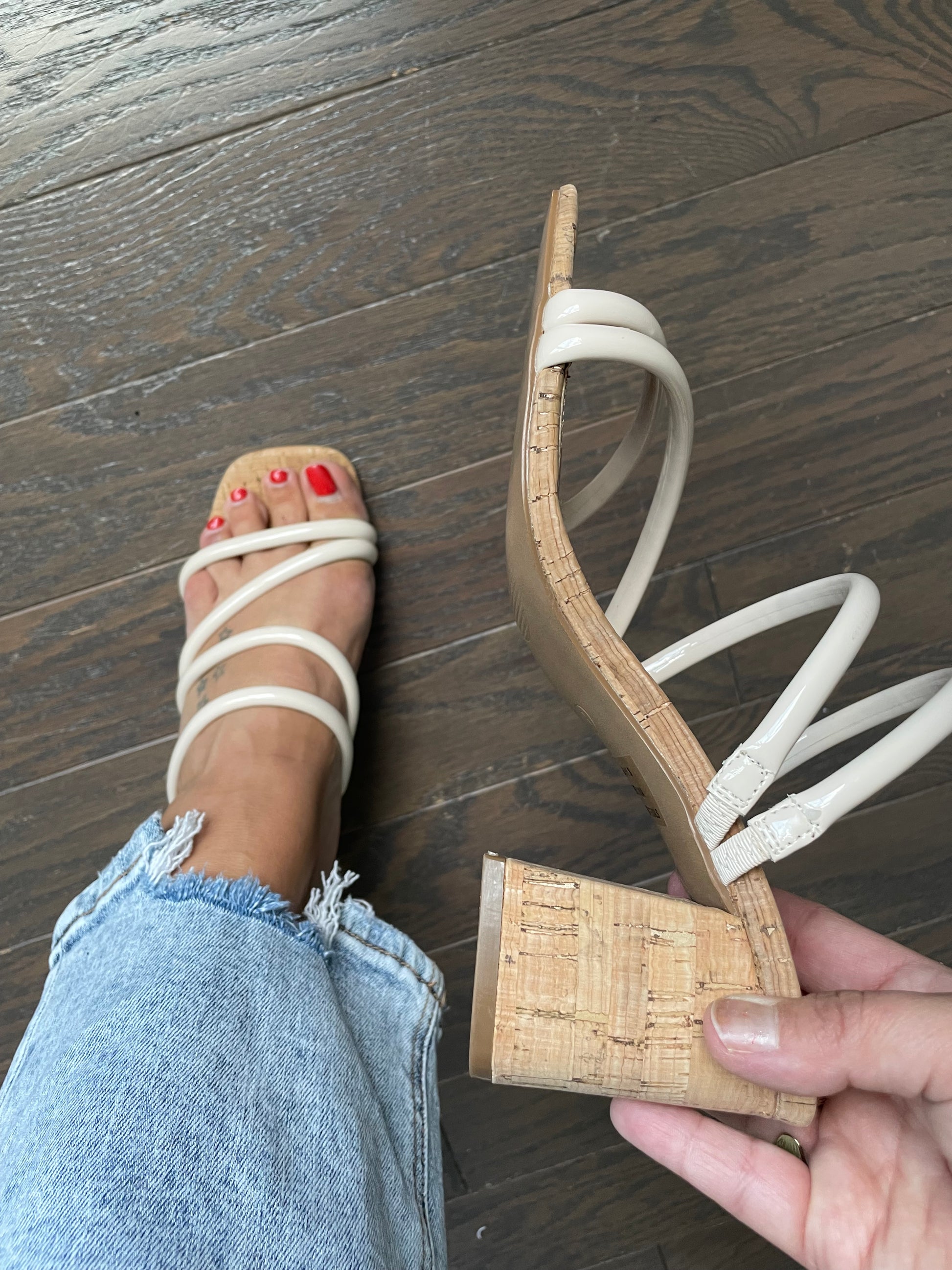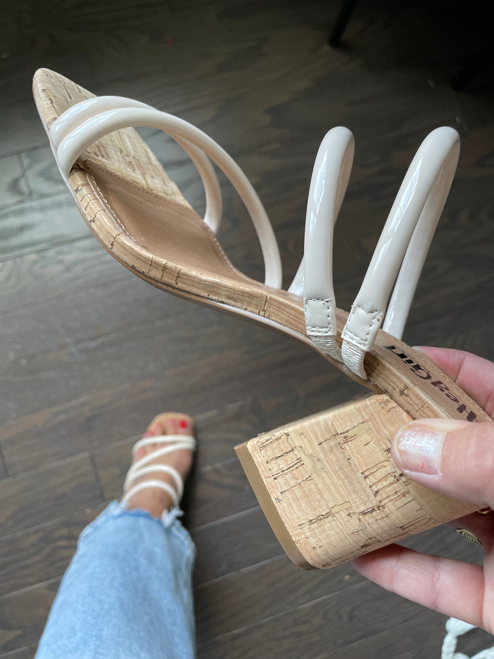 Look amazing and feel your best in the Walk the Walk strappy sandal in Ivory! This stylish sandal features a cork block heel, a comfy foot bed, and faux patent leather straps for extra detail. Strut your stuff with confidence and style!