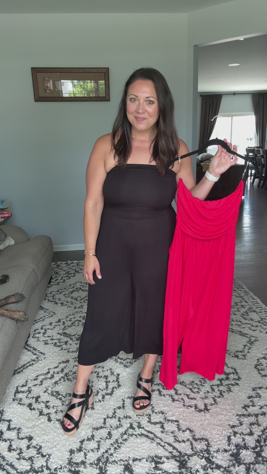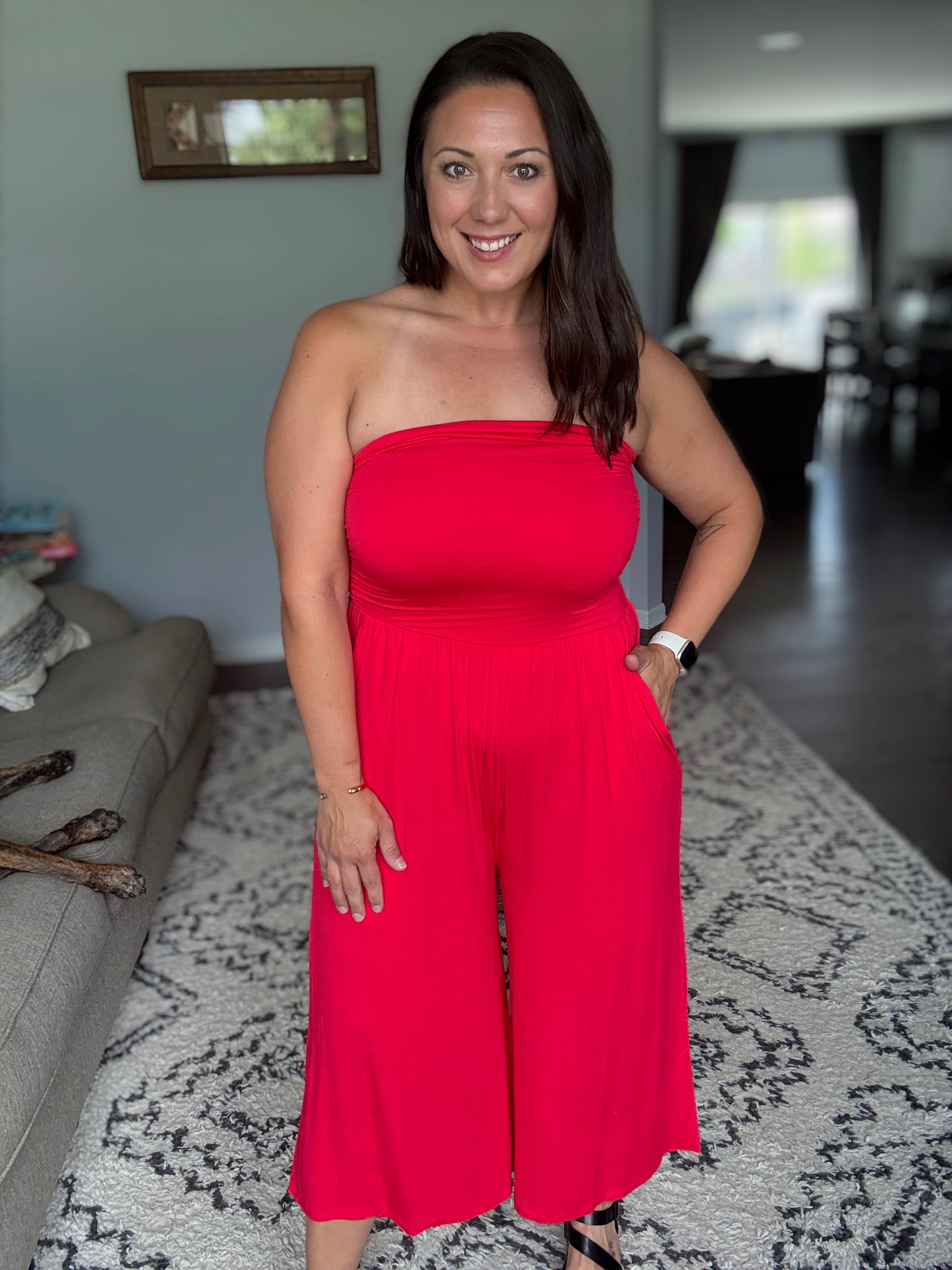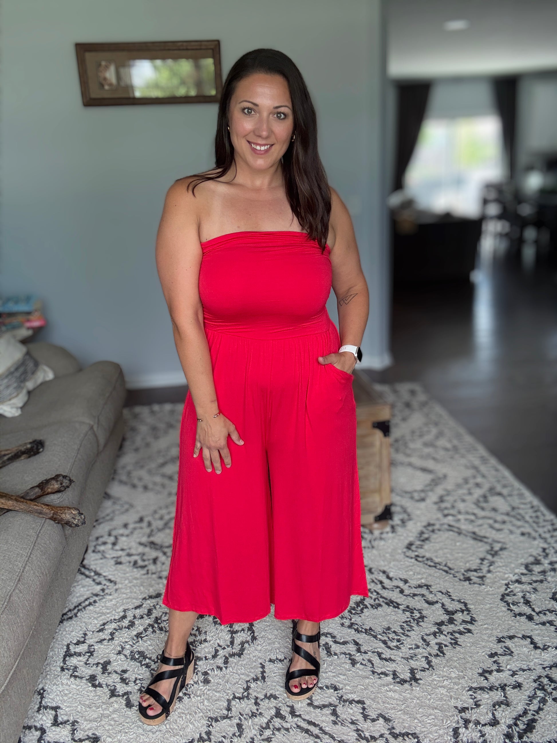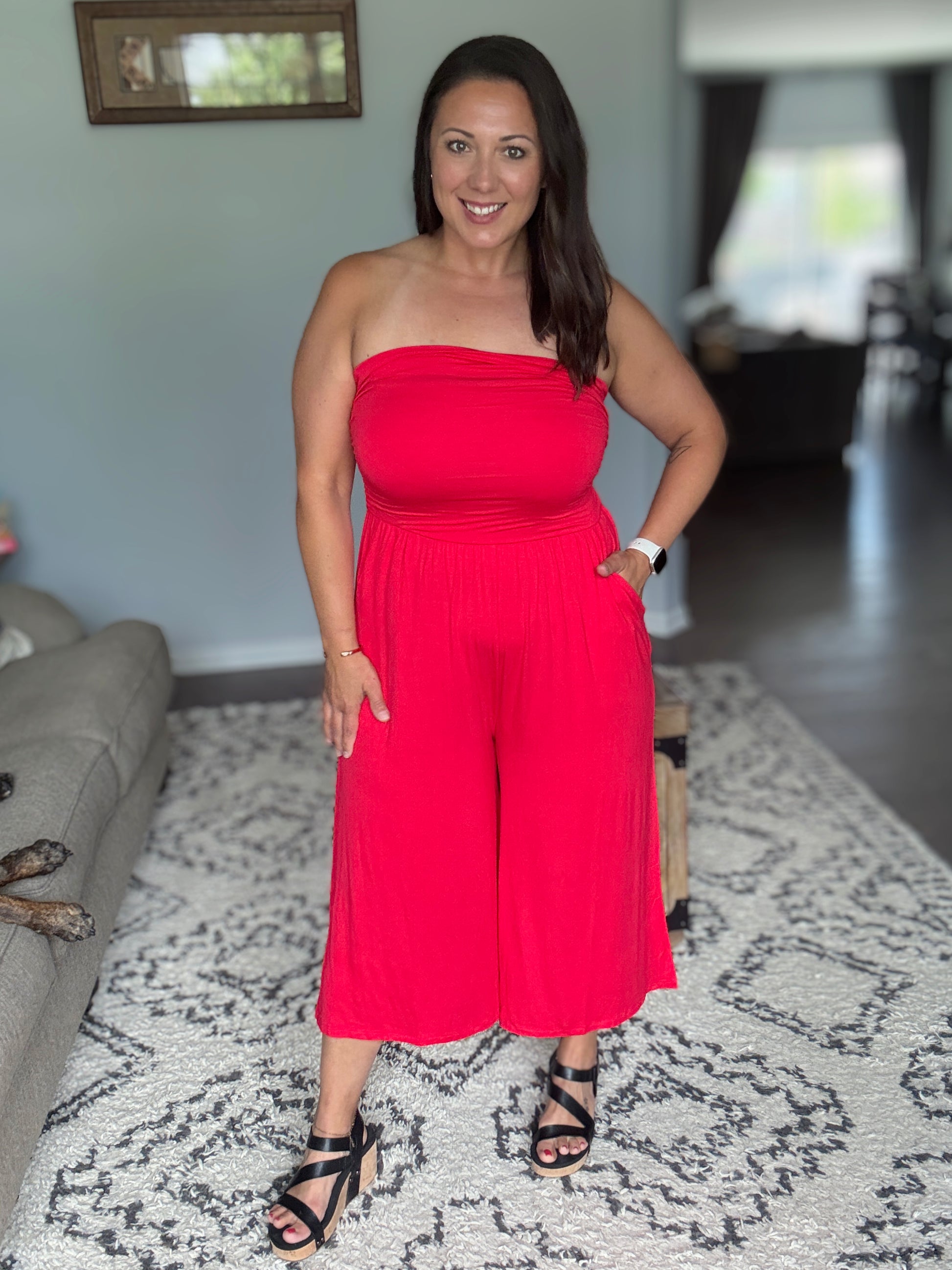 This stunning strapless jumpsuit features a beautifully ruched bodice that creates a flattering silhouette while the wide-leg culotte design offers both comfort and style. Crafted from soft, stretchy fabric blend with excellent drape, this piece includes practical side pockets and an elastic waistband for the perfect fit. The design make it suitable for everything from beach vacations to summer parties and perfect for warm weather occasions.