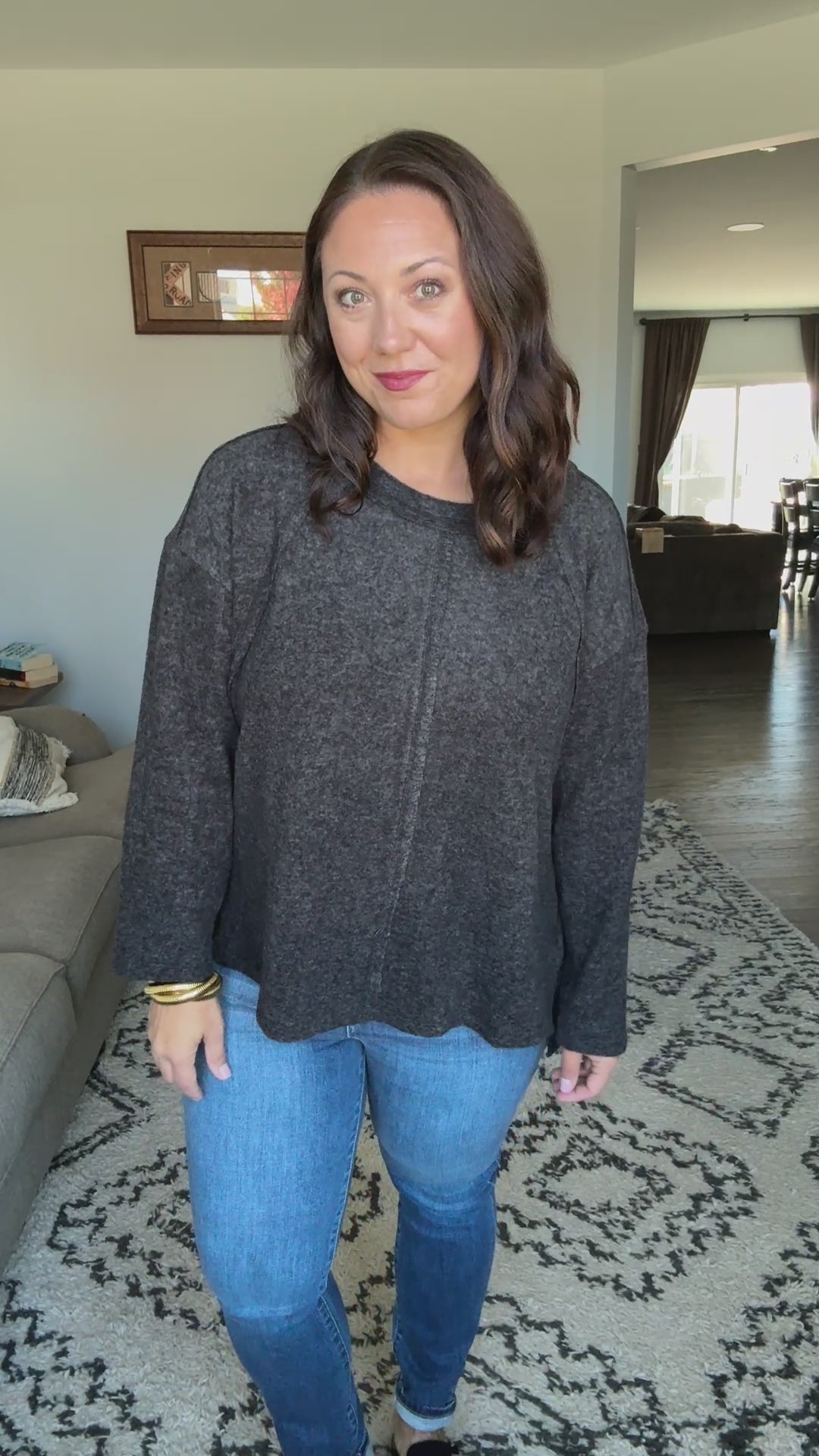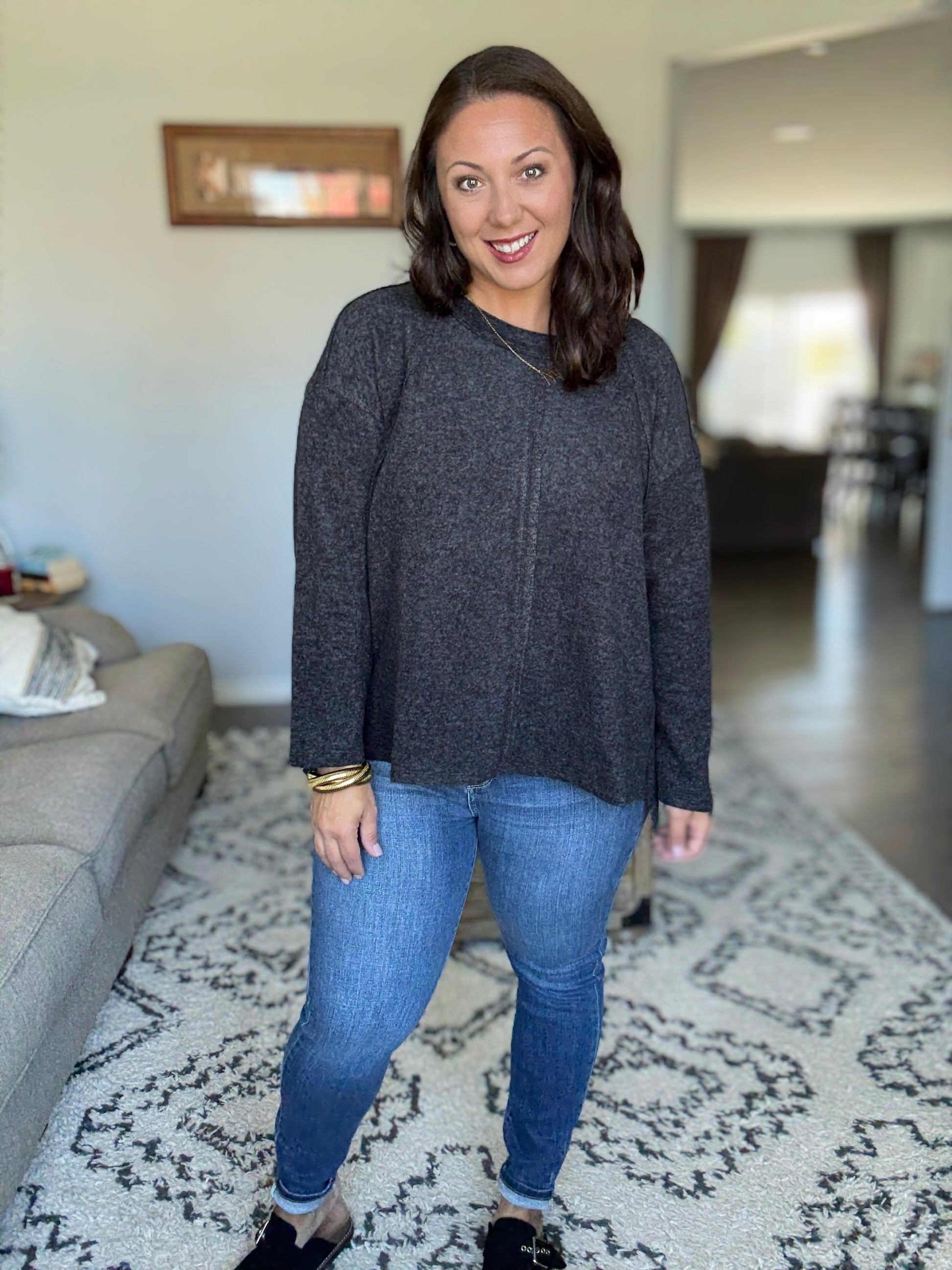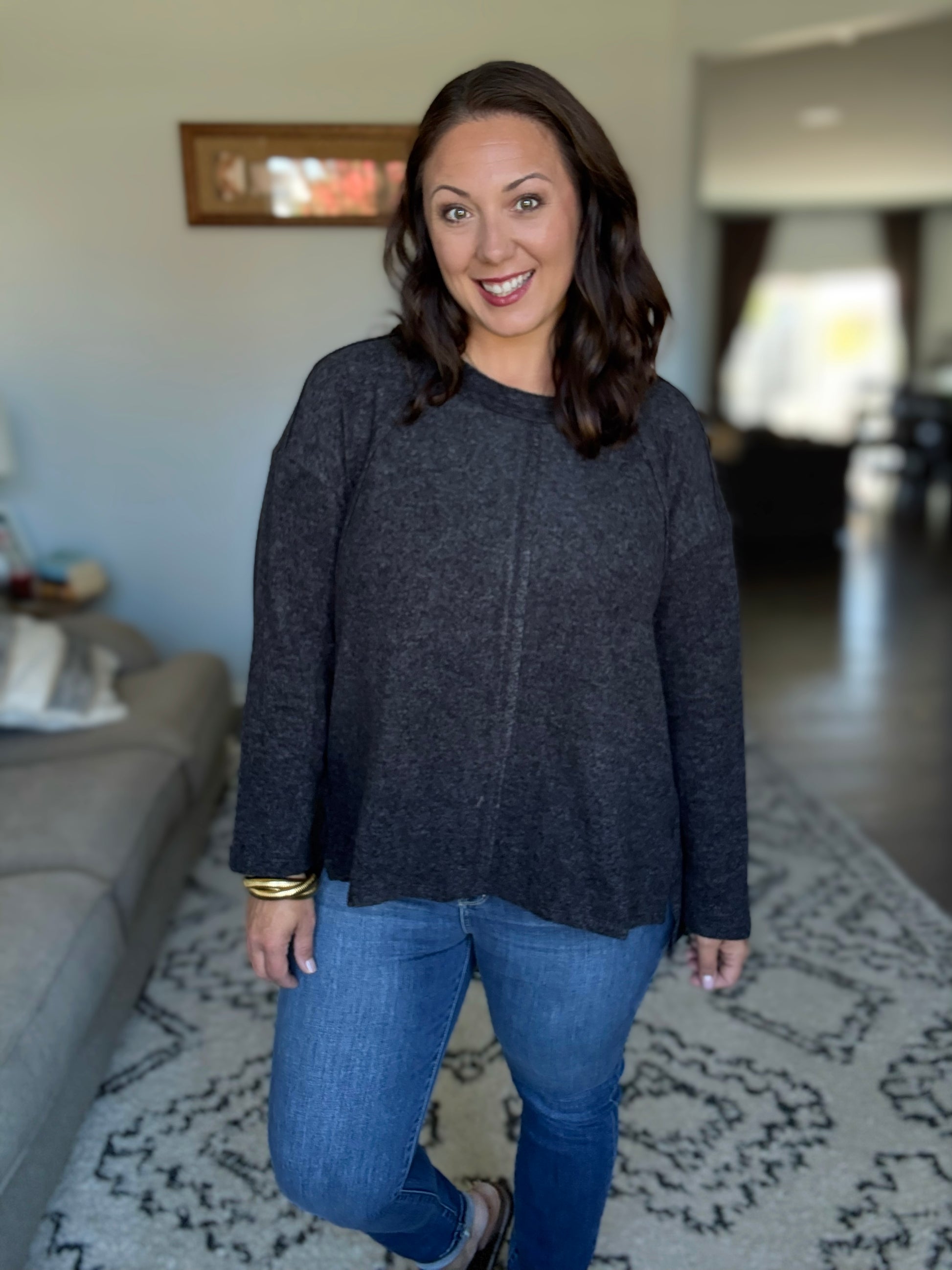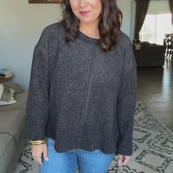 This Zenana Brushed Hacci Exposed Seam Hi Low Sweater features premium brushed hacci knit fabric that provides exceptional softness and comfort. The distinctive exposed seam construction adds contemporary design elements while the hi-low hemline creates a modern, flattering silhouette. Made from a lightweight yet cozy material, this pullover sweater offers a relaxed fit perfect for casual everyday wear. The heathered charcoal black colorway provides versatile styling options that easily pairs with denim, leggings, or other wardrobe essentials. The long sleeve design and pullover construction make it ideal for transitional weather and layering. Features:Basic style,Oversized,Raw Hem
