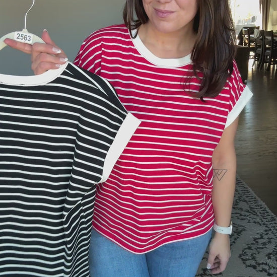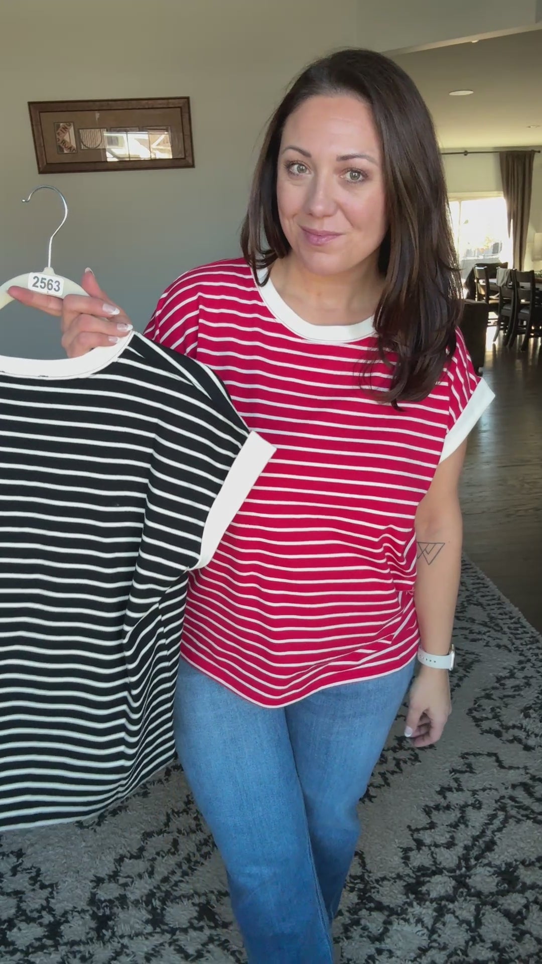 Classic stripes meet easy everyday comfort in this flattering cap sleeve tee. The contrast trim at the neckline and sleeves gives it that just-a-little-extra detail while still being an effortless grab-and-go top. Soft, stretchy, and easy to style — this one works just as well with denim as it does layered under jackets and cardigans.