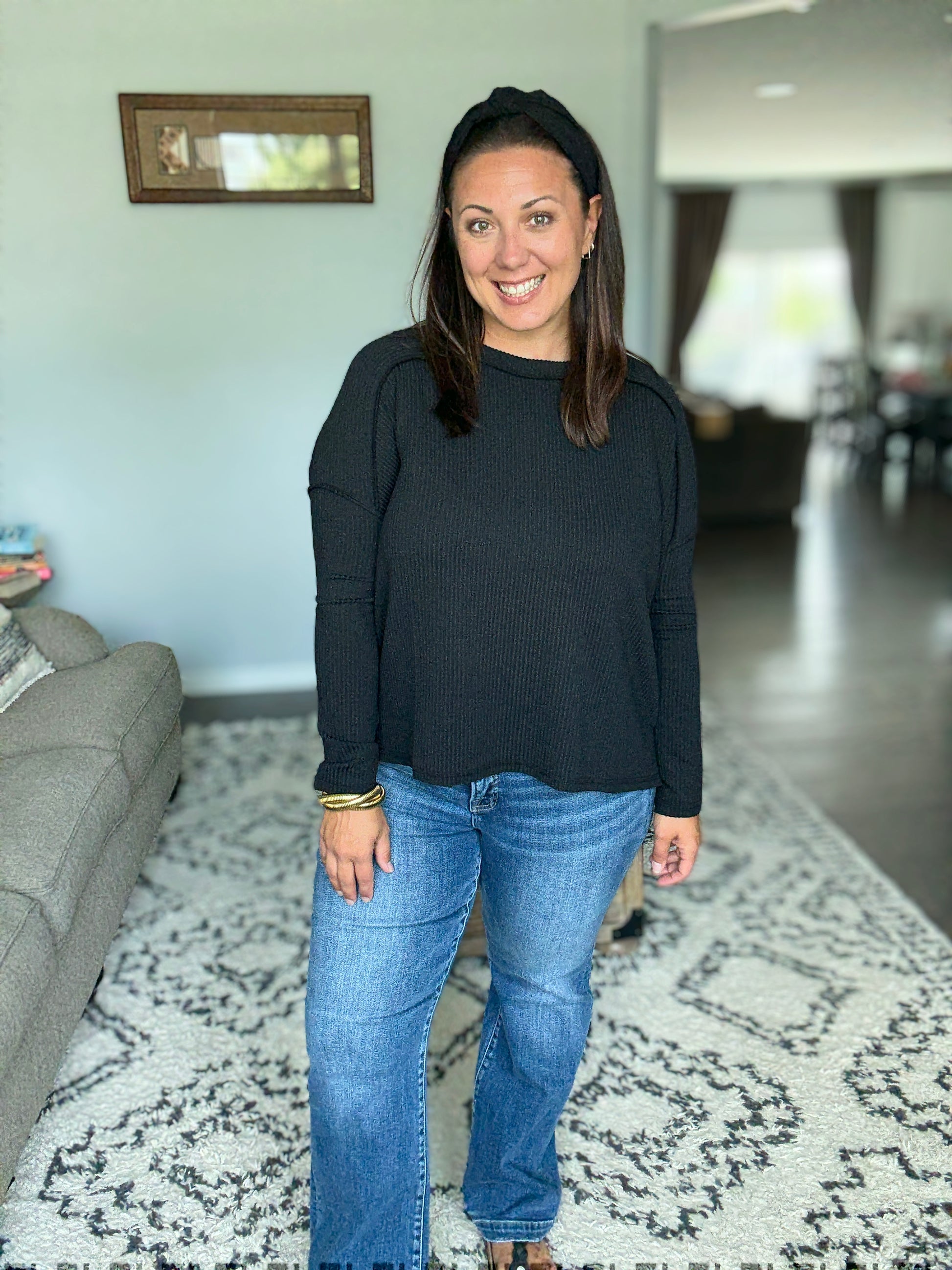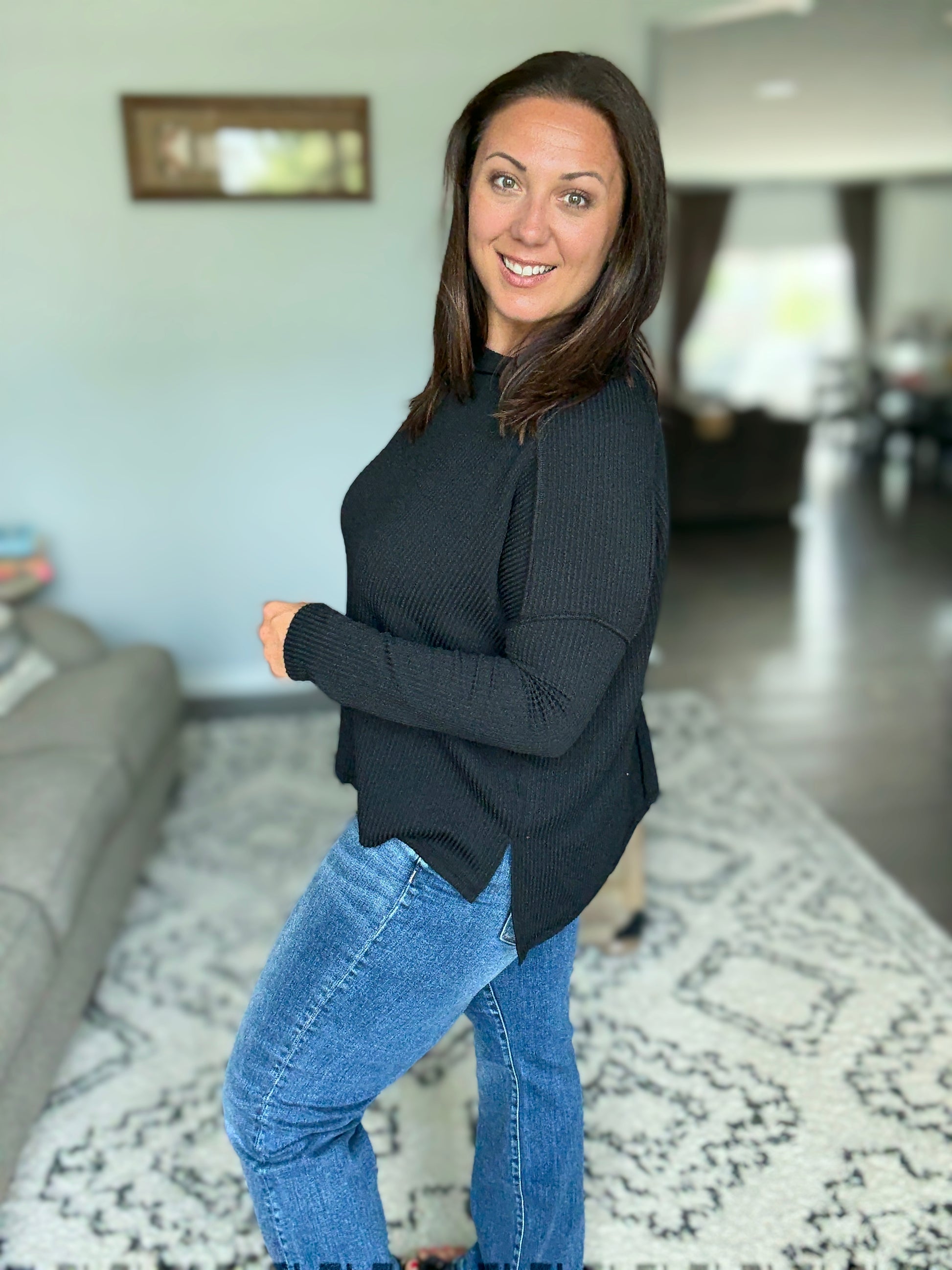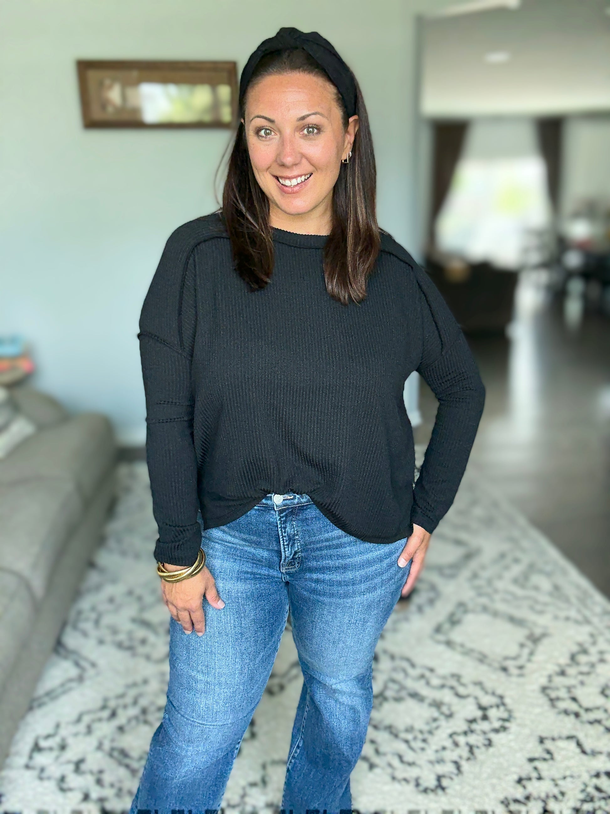 Wander & Rest Cable Ribbed Knit Drop Shoulder Top in Black