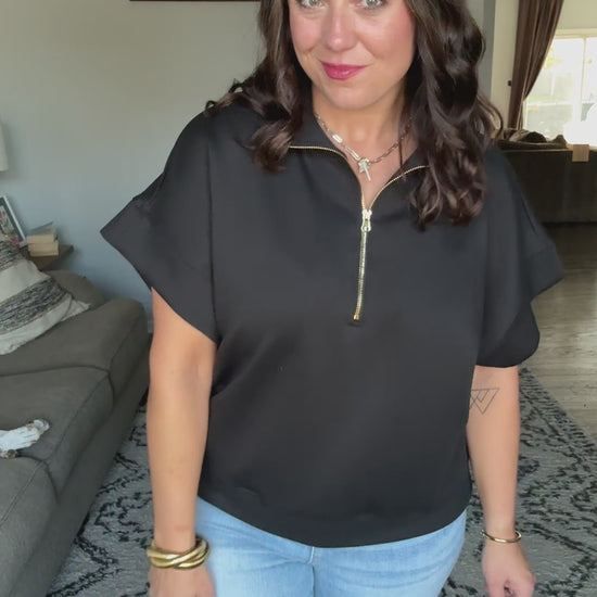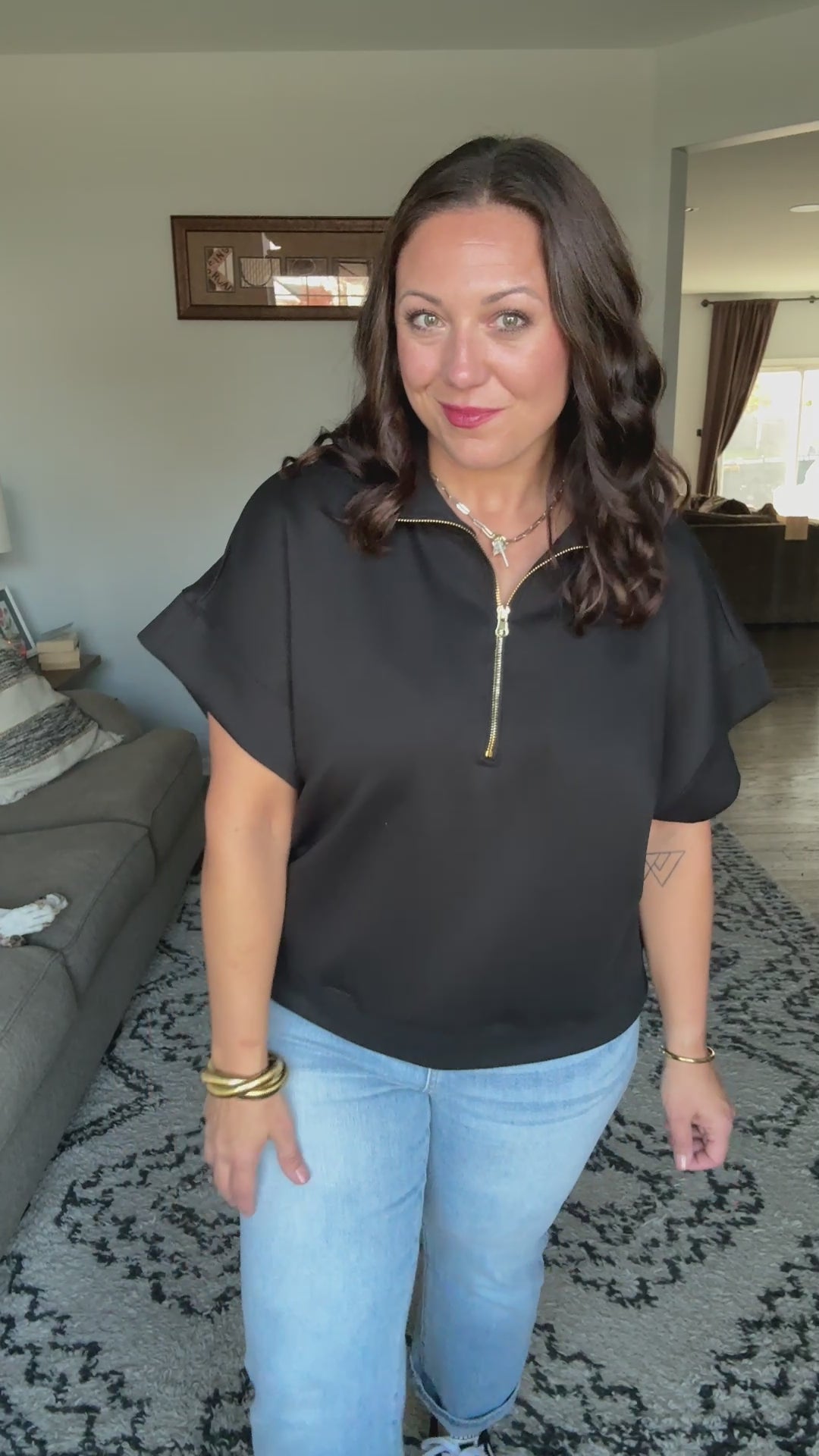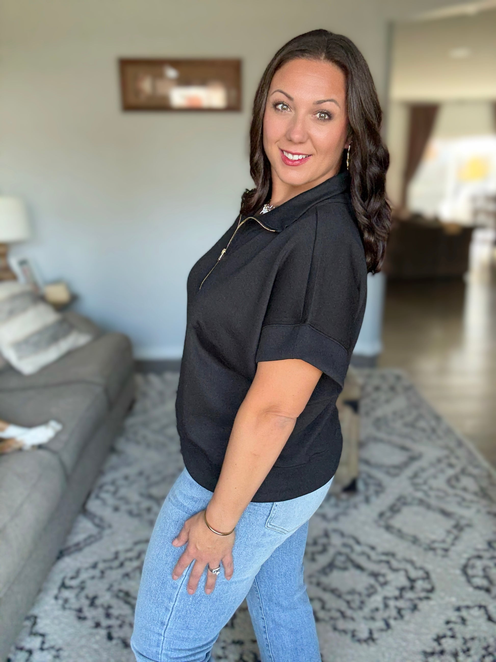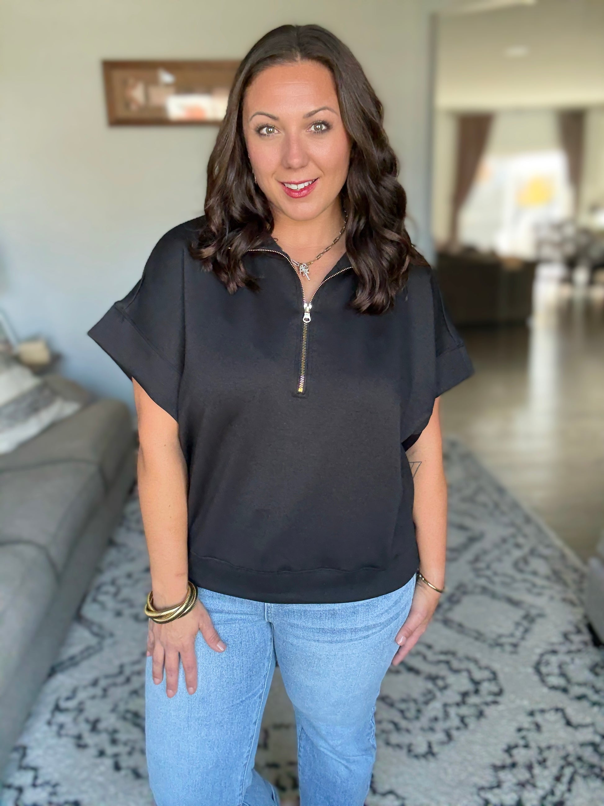 Zenana Full Size Scuba High Neck Half Zip Short Sleeve Top in Black