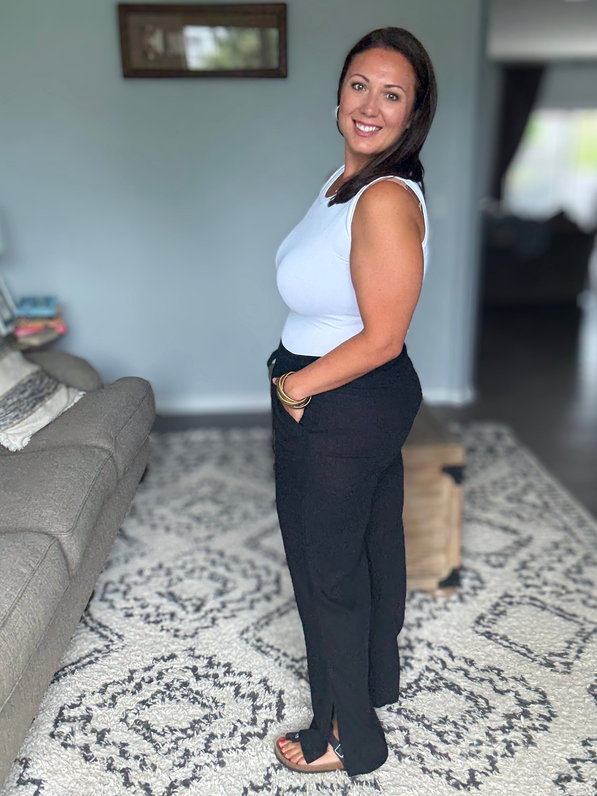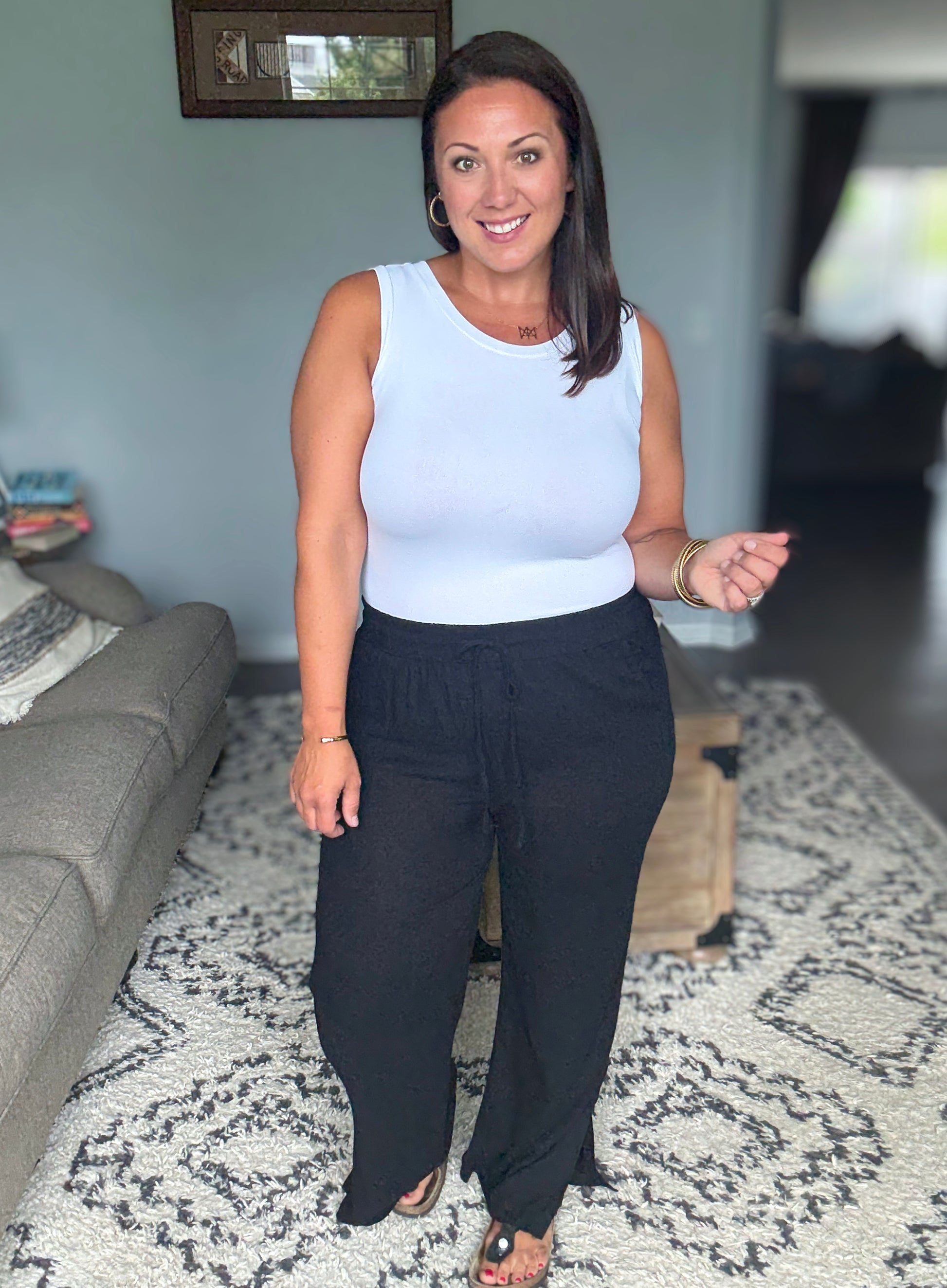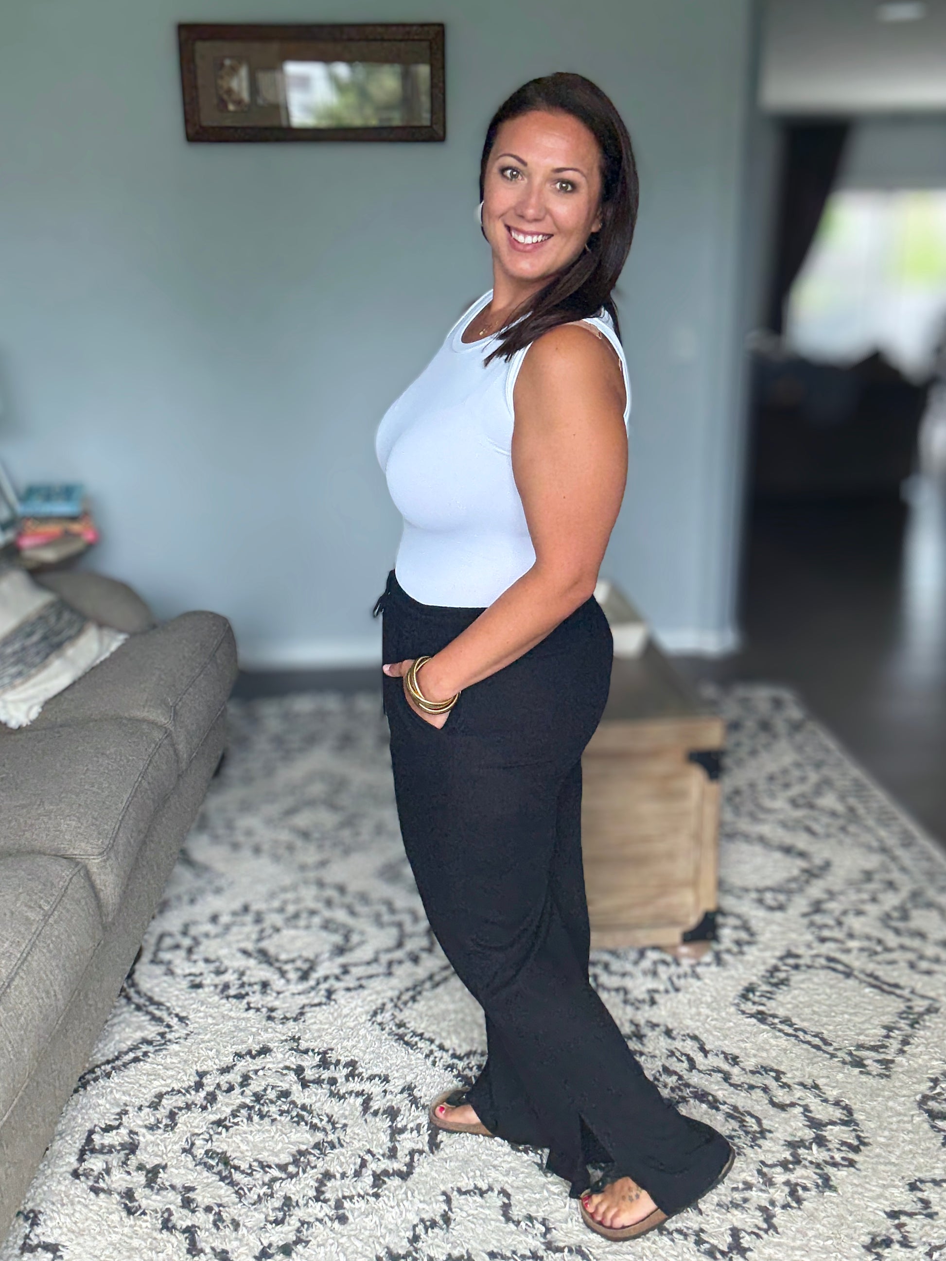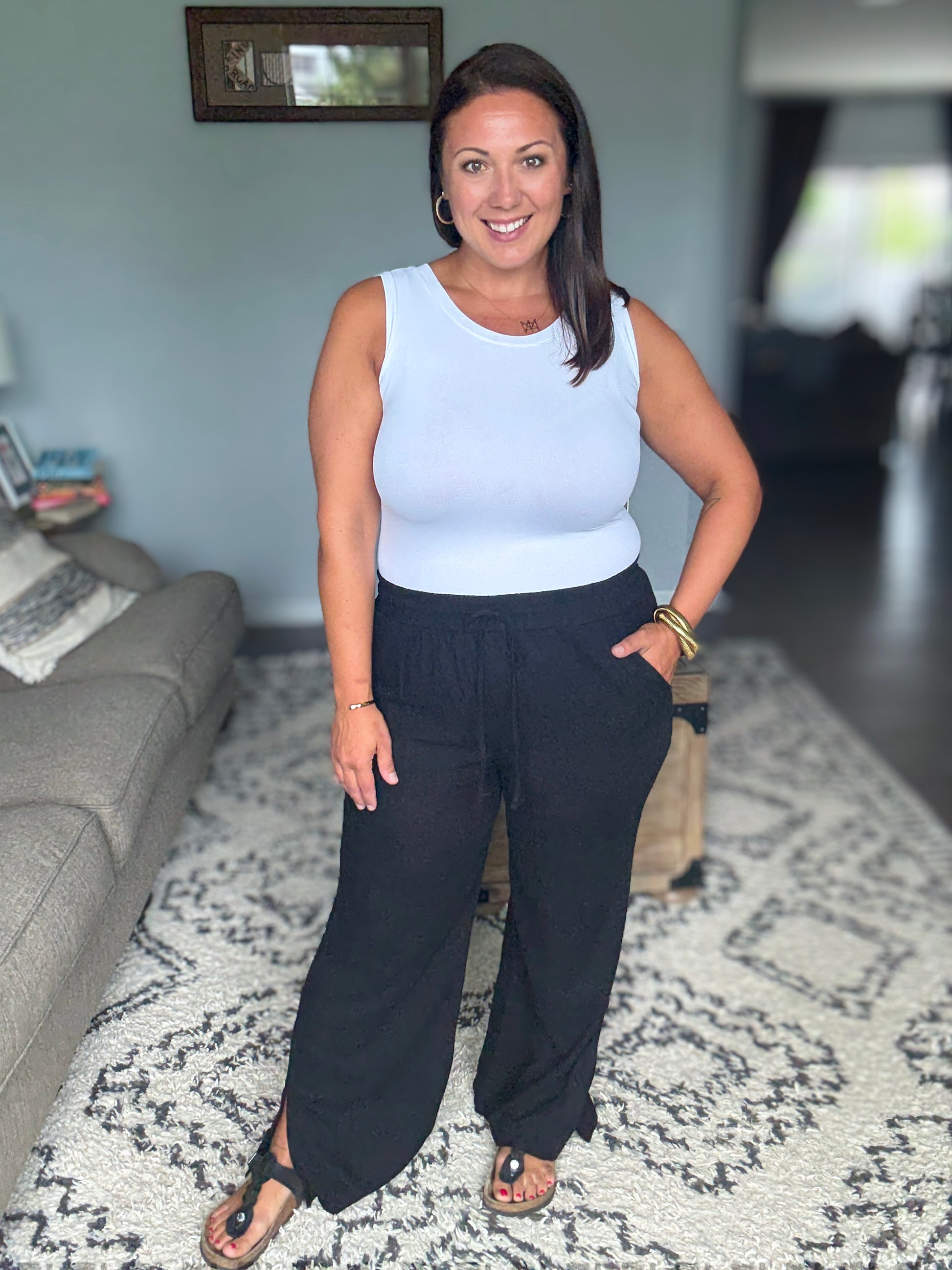 These versatile wide leg pants feature a comfortable elastic waistband with adjustable drawstring for the perfect fit. Crafted from soft, breathable fabric blend that moves with you throughout the day. The relaxed wide leg silhouette offers maximum comfort while side slit details add a modern touch and enhanced mobility. Perfect for lounging at home, casual outings, or layering for different occasions. The pull-on design eliminates the need for zippers or buttons, making them not only comfortable but easy to wear.