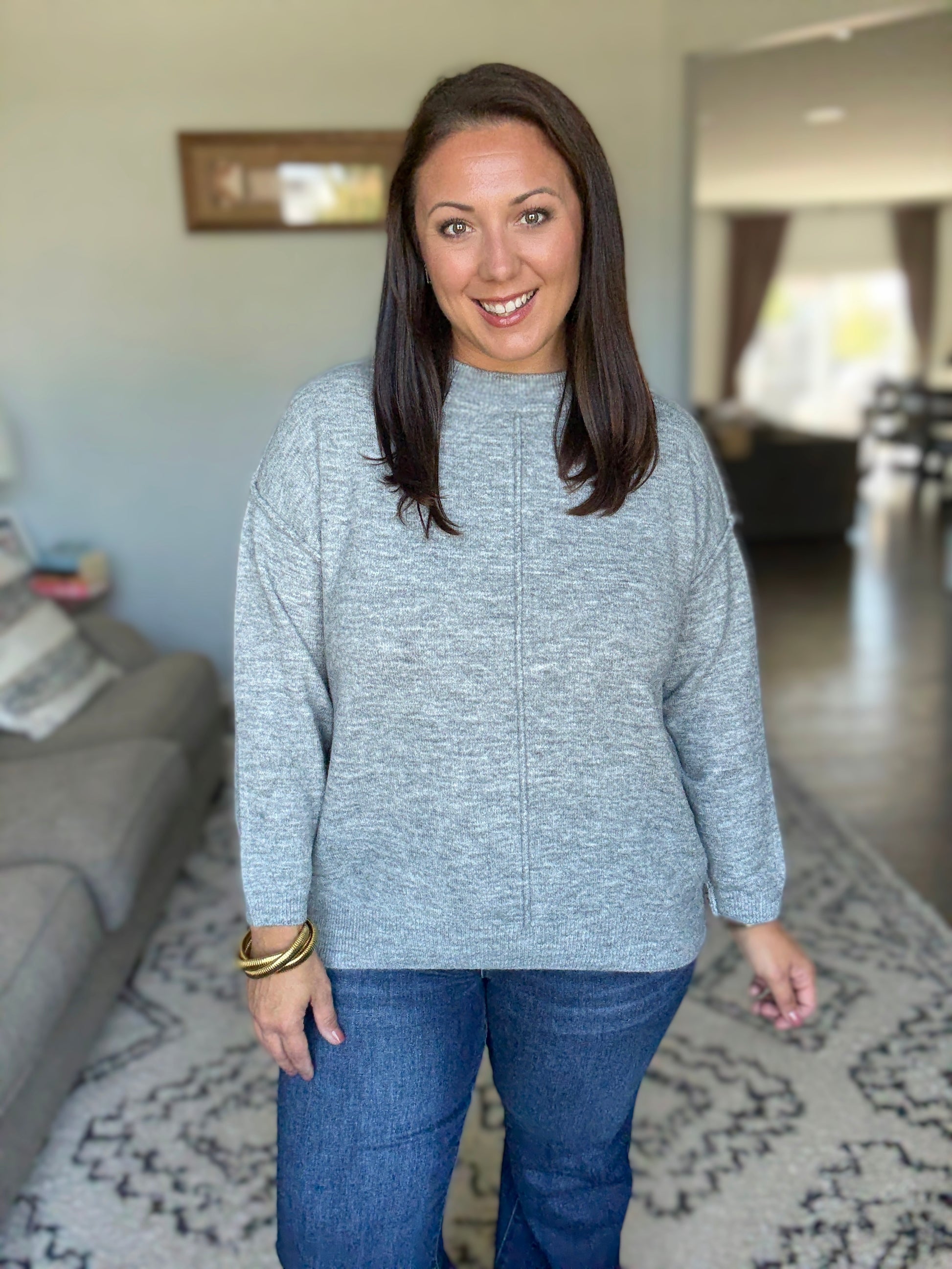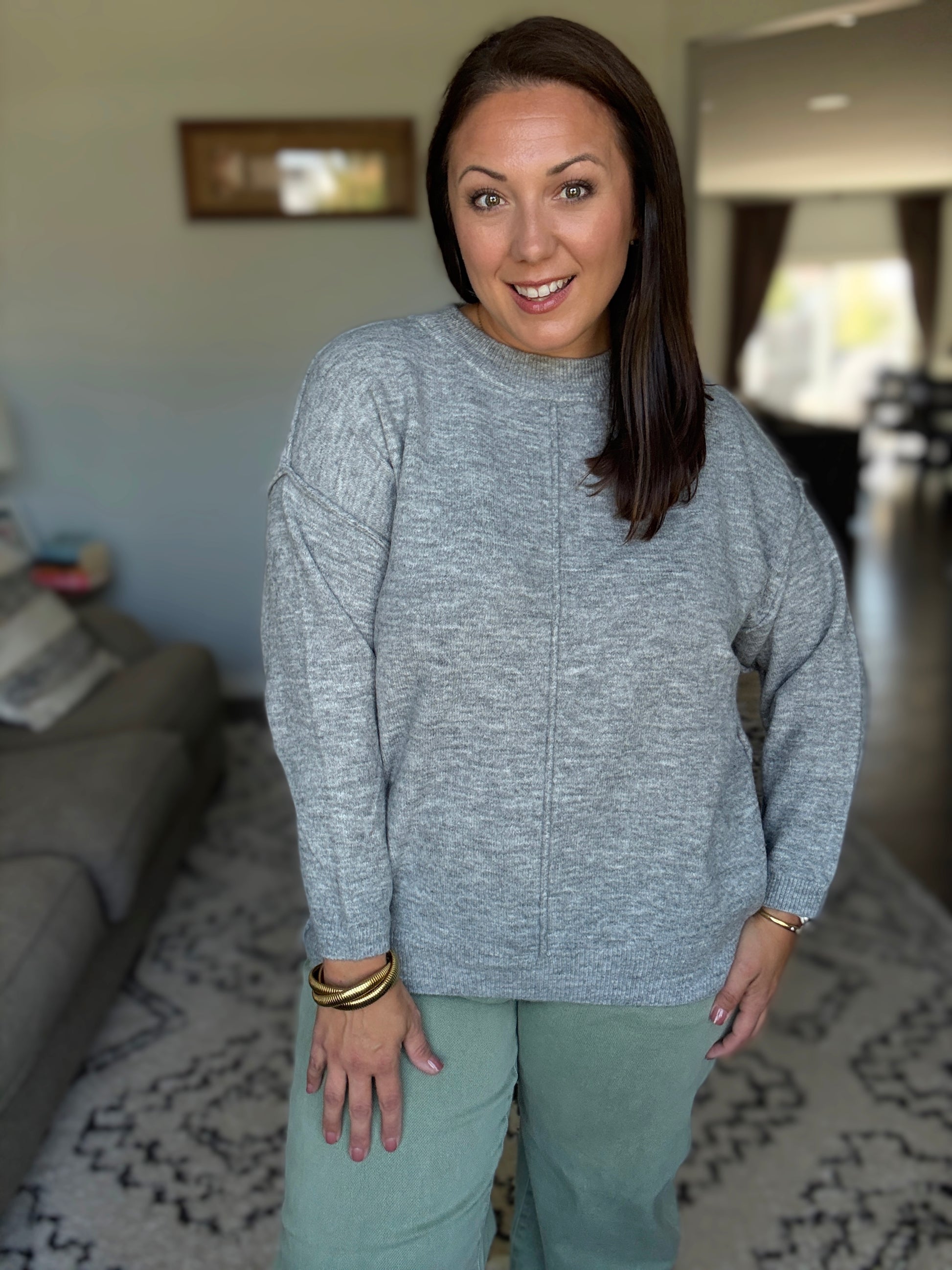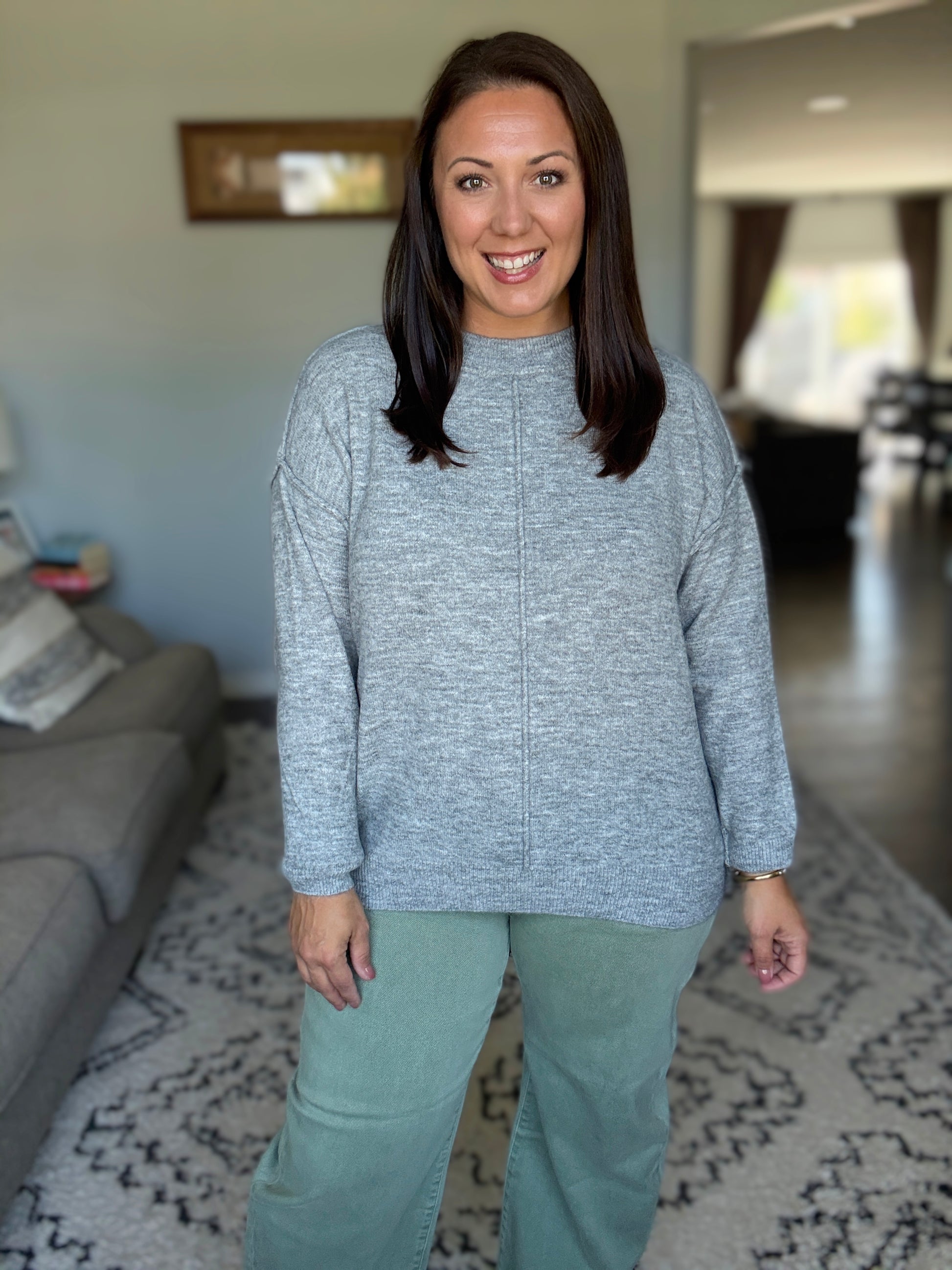 Zenana Melange Front Seam Round-Neck Sweater in Heathered Grey