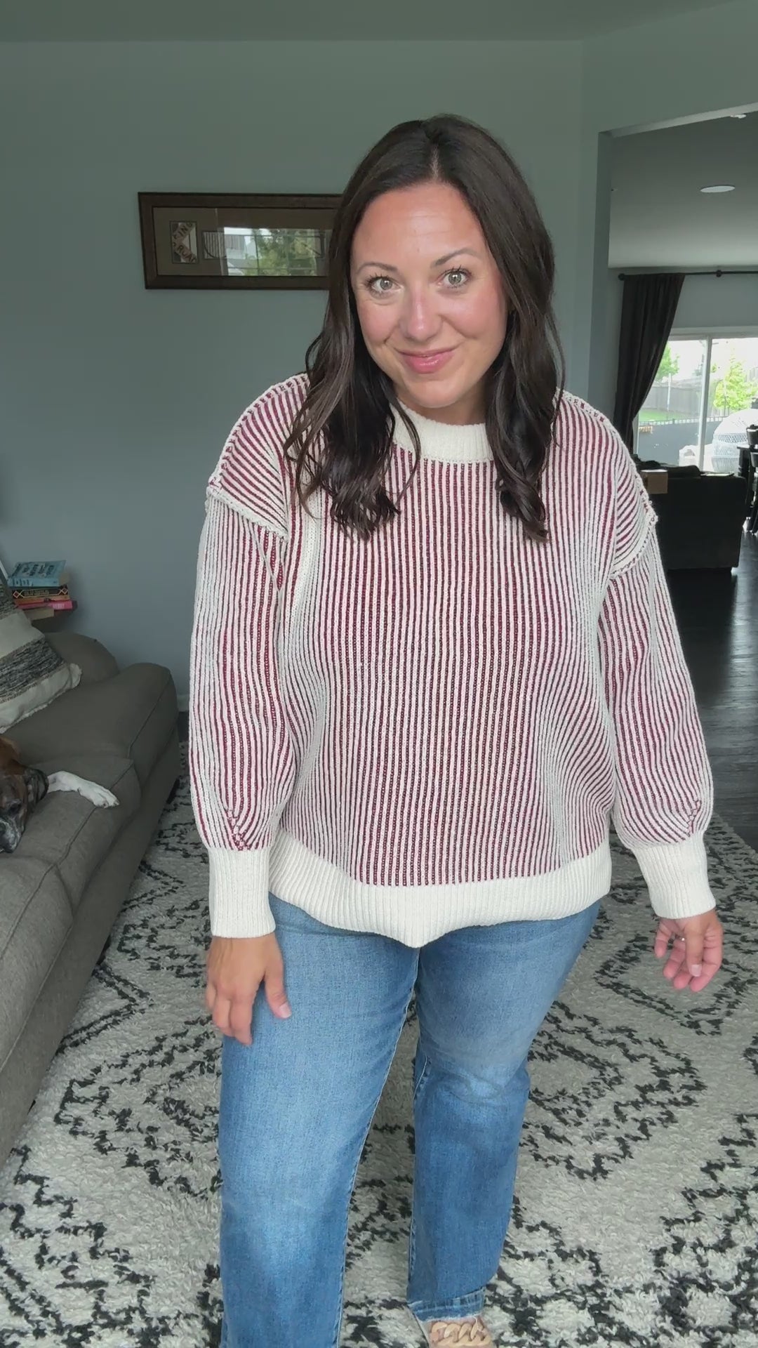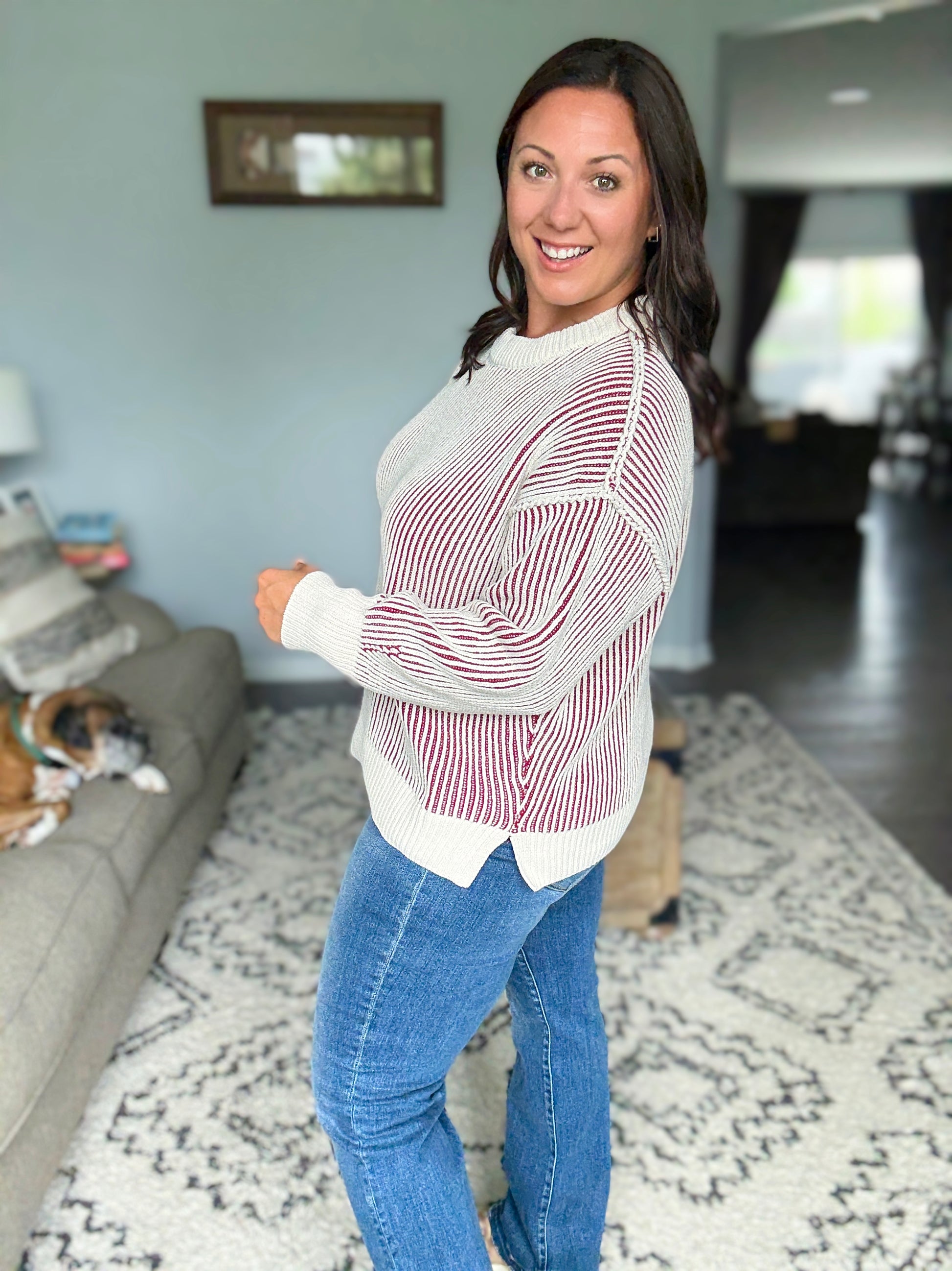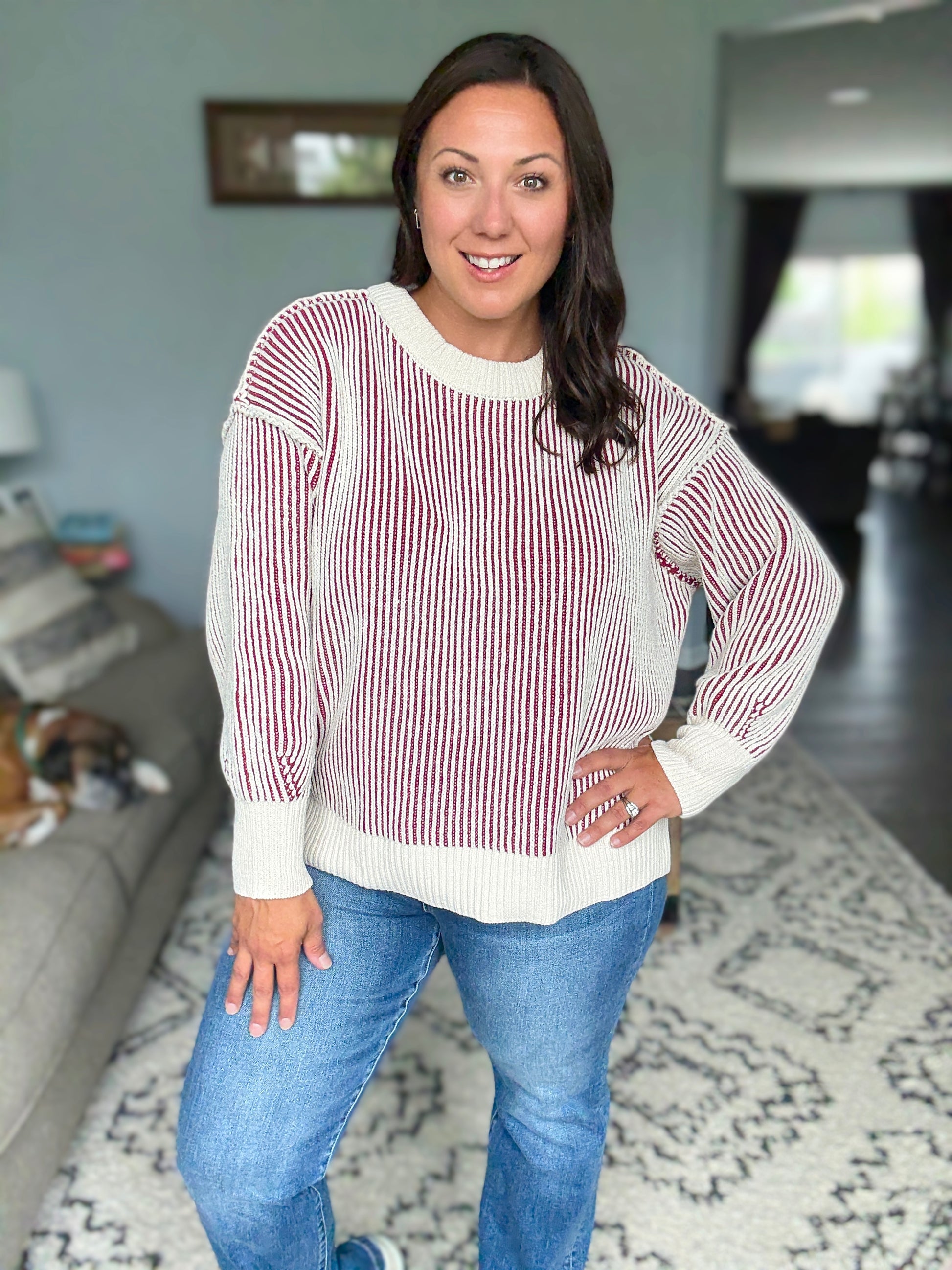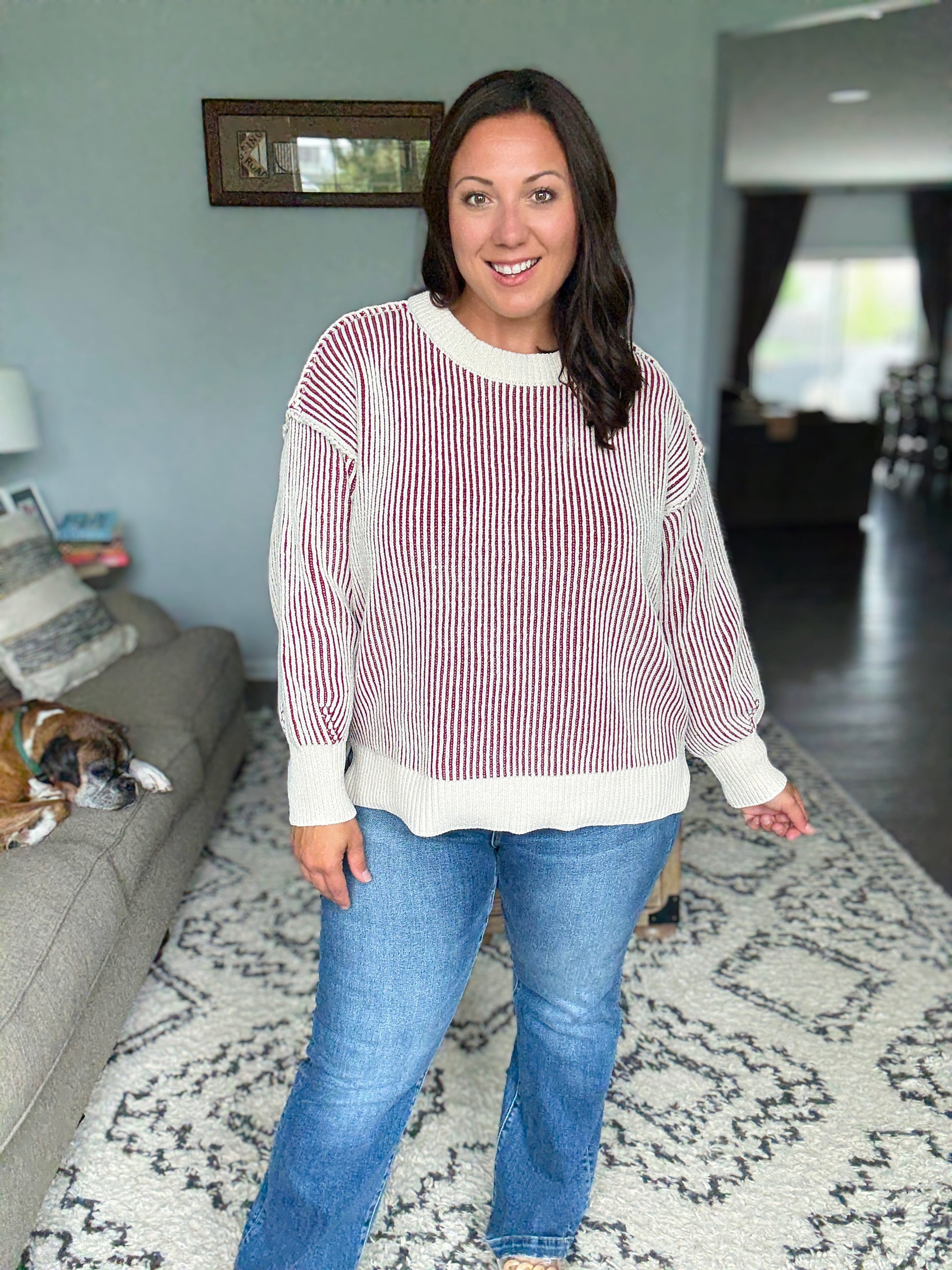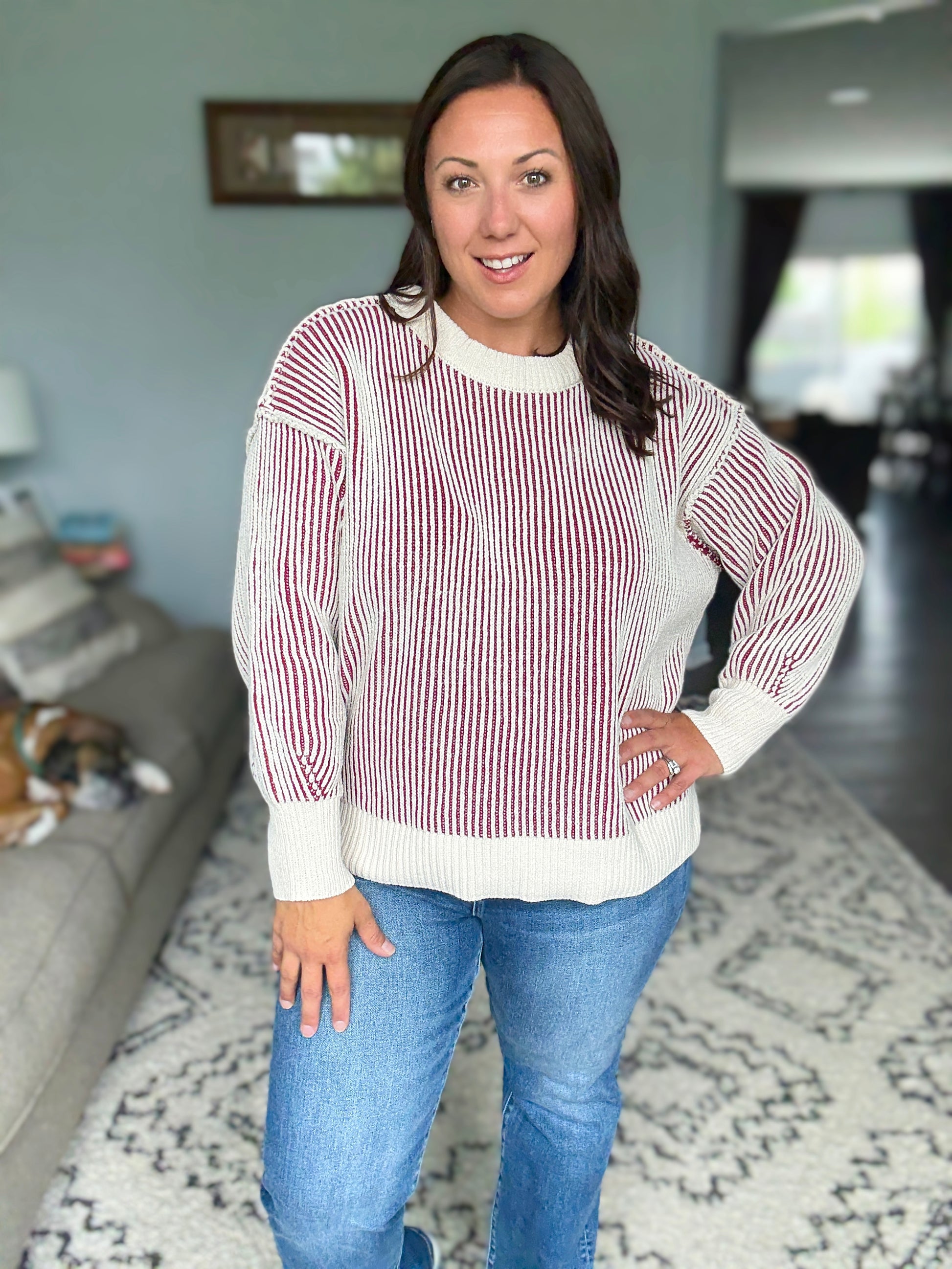 This two-tone striped sweater features a classic ribbed knit construction with vertical stripes. Made from soft, breathable chenille-feel knitted fabric that provides comfort and warmth. The relaxed fit offers a modern casual look perfect for layering or standalone wear. Features include long sleeves, crew neckline, and contrasting ribbed cuffs and hem. The versatile design pairs easily with jeans, leggings, or skirts for effortless styling. It's almost sweater weather, baby.
